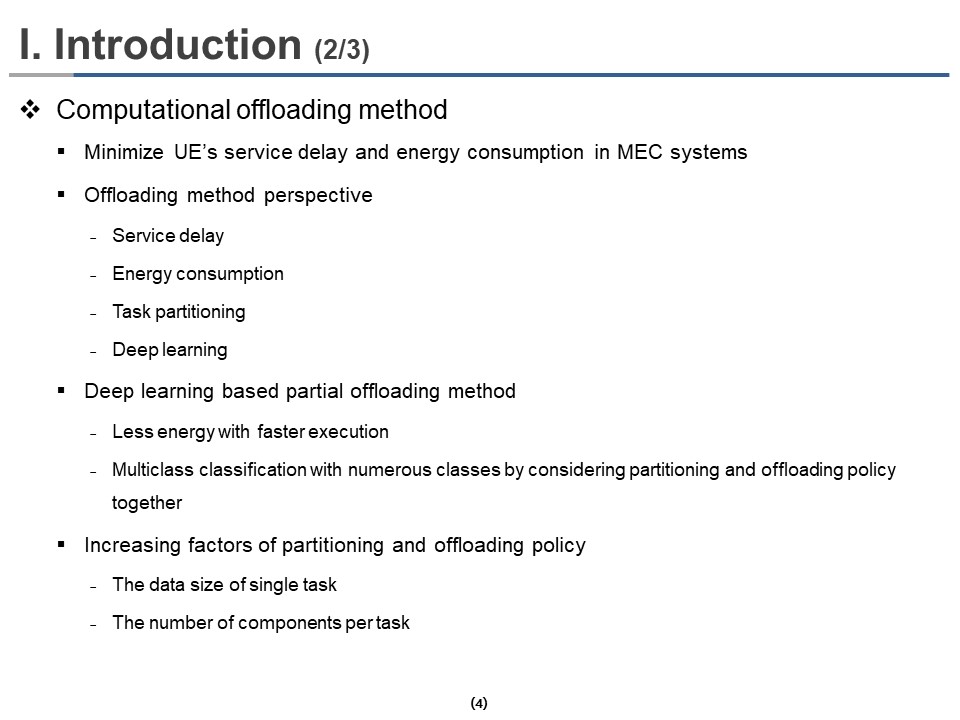 The deep learning-based partial offloading method consumes less energy with faster execution in MEC networks than the conventional methods. However, this method performs multiclass classification with numerous classes by combining partitioning and offloading policies. So, the number of class partitioning and offloading policies increases exponentially as the data size of a single task and the number of components per task increases.