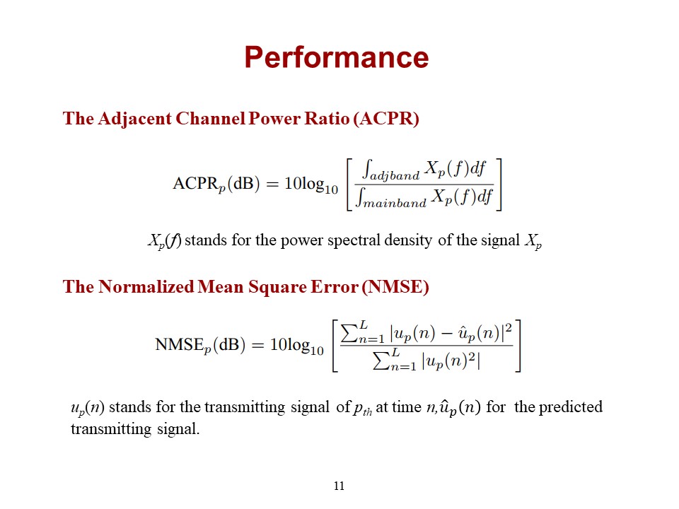 In order to evaluate the equalization performance, the adjacent channel power ratio, namely ACPR, and Normalized Mean Square Error, namely NMSE, are used as evaluation criteria. | |