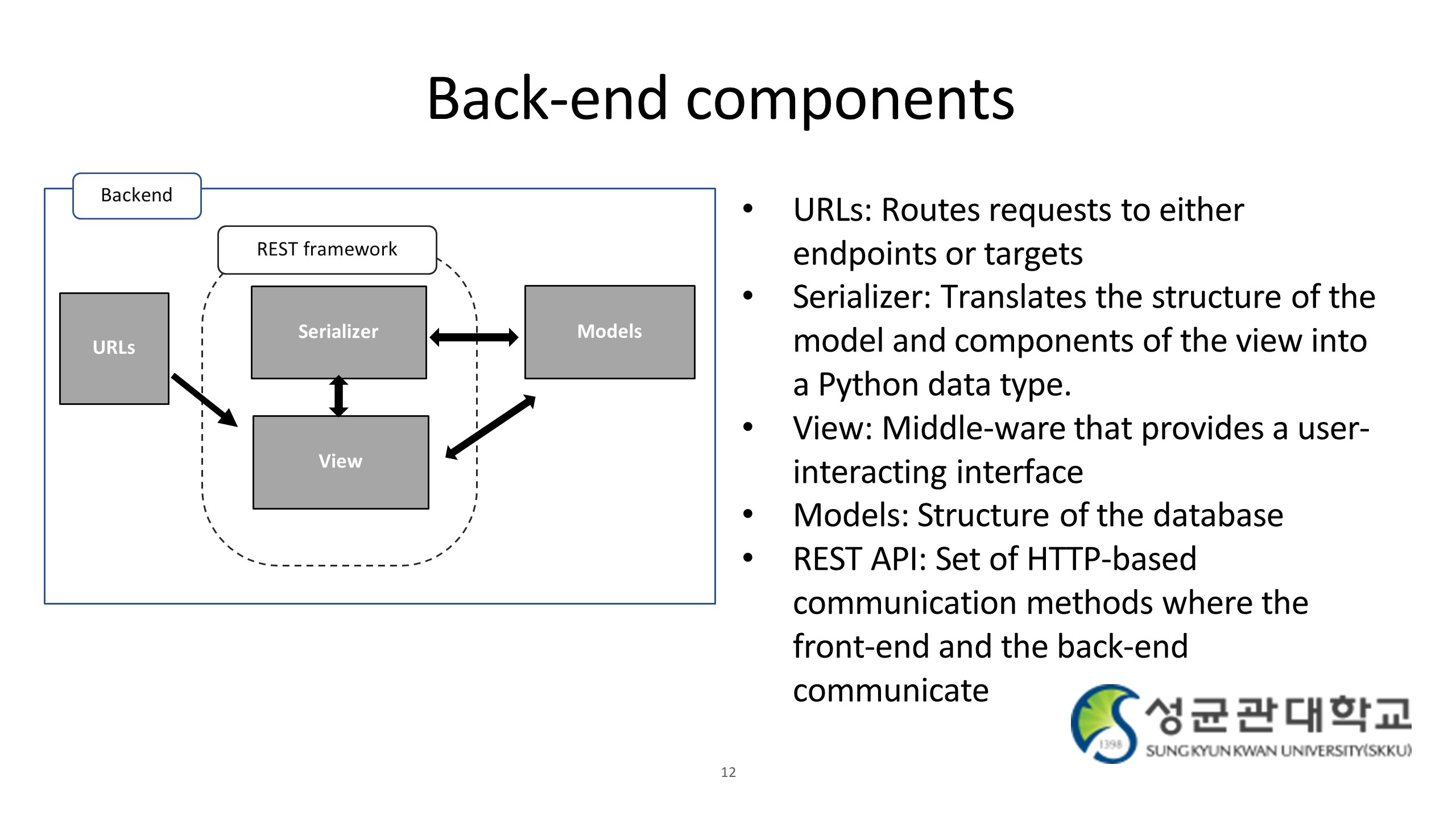 The Back-end of the proposed architecture is equipped with REST-API and several components : URLs, Serializer, models, and rest API.