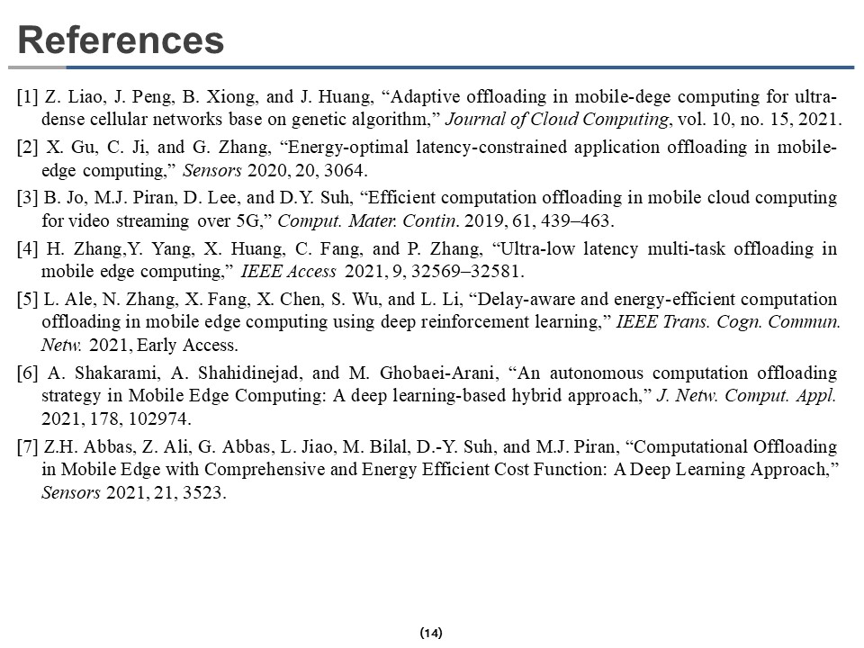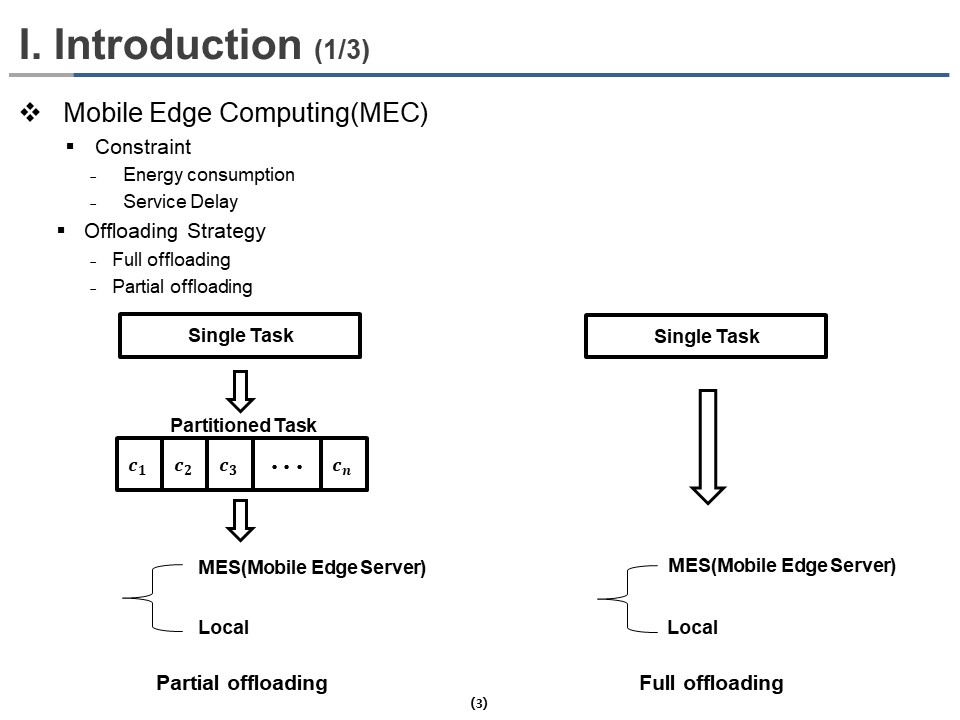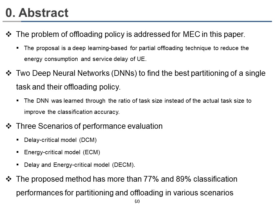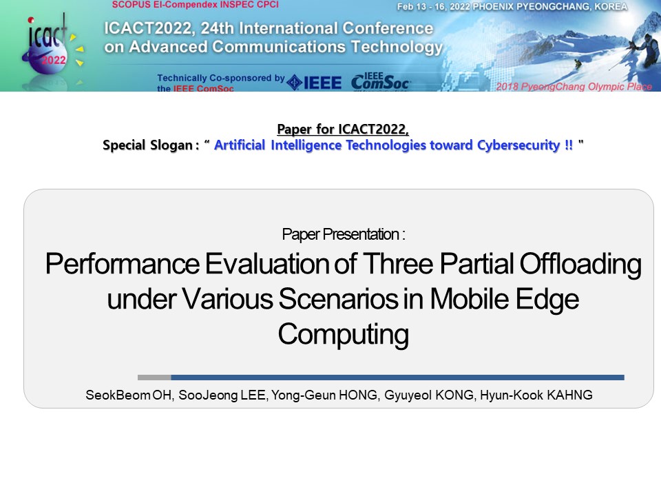 Hi everybody, my name is Seokbeom Oh. For ICACT 2022, I and Professor Hyun-kook Kahng have cooperated with two professors. Professor Yong-Geun Hong from Daejeon University, and Professor Gyuyeol KONG from ChoungShin University. Today, our presentation is about the computational offloading method called Performance Evaluation of Three Partial Offloading under Various Scenarios in Mobile Edge Computing.