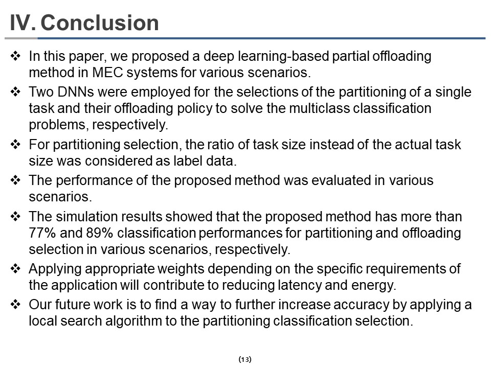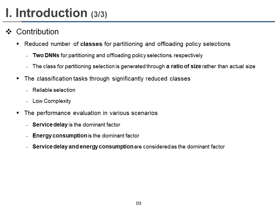 To reduce the number of classes for partitioning and offloading policy selections, we first used two DNNs for partitioning and offloading policy selections, respectively. It could significantly reduce the combination of classes between partitioning and offloading policy. Second, the class for partitioning selection is generated through a ratio of size rather than actual size. It mitigates the rapid increase in the number of classes as data size increases. The proposed method uses two techniques to perform classification tasks through significantly reduced classes, enabling low complexity and reliable selections for partitioning and offloading policy.