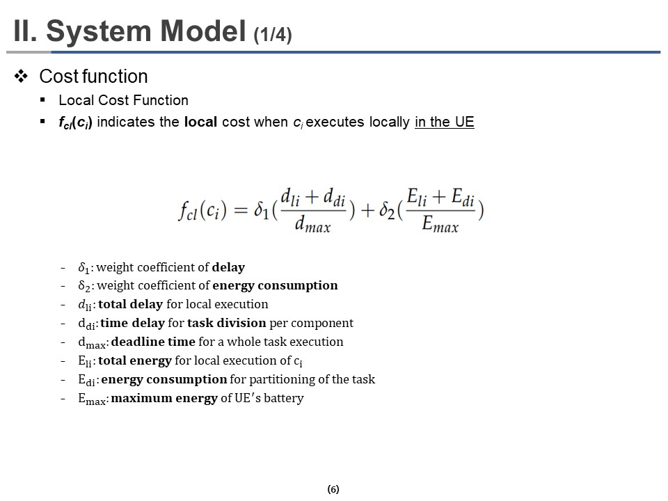 In the system model section, we present a method of calculating the cost function for partial offloading and deep learning model structure. fcl(ci) indicates the local cost when ci executes locally in the UE where ci is the ith components of a single task. The cost function for local execution fcl(ci) can be calculated as follow.