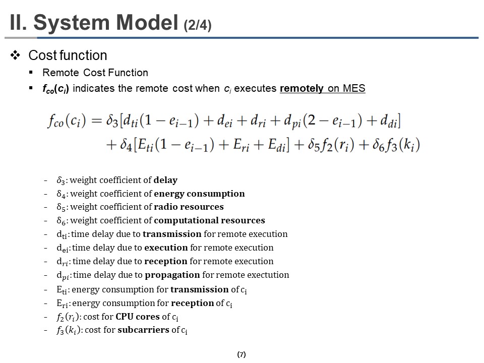 Where ¥ä3, ¥ä4, ¥ä5 and ¥ä6 are the weighting coefficient by which we can change the contribution and priority of time delay, energy consumption, radio resources, and computational resources in the cost function. We set the sum of all coefficients to be 1. In the delay parameters, dti, dei, dri, and dpi are delays due to transmission, execution, reception, propagation for remote execution of ci, respectively. Eti and Eri are the energy consumption in the energy parameters due to transmission and reception for remote execution of ci, respectively. We multiply (1 – ei-1) with dti and Eti if the previous component ci-1 was executed at MES, where ei is an indicator that means 0 when ci executes locally and 1 when ci executes remotely at MES. It means the next component ci is available at MES and does not need to be retransmitted. Similarly, dpi (2 – ei-1) gives propagation delay only for reception. f2(ri) and f3(ki) give the cost due to used CPU cores and subcarriers, respectively, where ri represents the number of CPU cores used to process ci and ki represents the available subcarriers of ci.