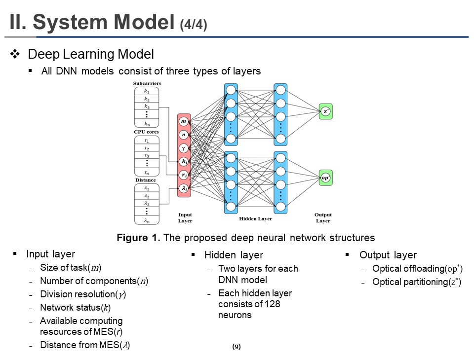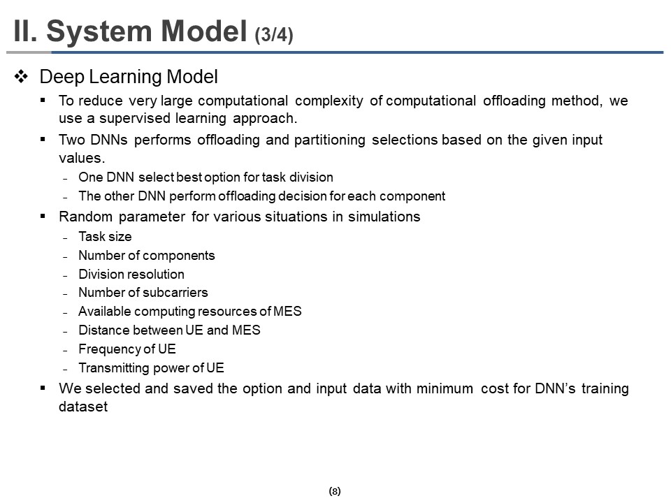 We selected and saved the option and input data with minimum cost to generate a dataset for training deep neural network models. We randomly generated task size, number of components, division resolution, number of subcarriers, available computing resources of MES, the distance between UE and MES, frequency of UE, transmitting power of UE to consider simulations in various situations.