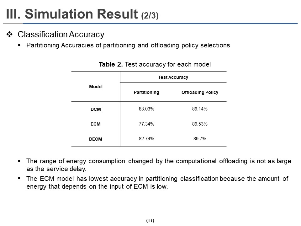 Table 2 shows the classification accuracies of partitioning and offloading policy selections. The classification performances of partitioning are 77% to 83%, and the classification performances of offloading policy are 89% for all models. The ECM has the lowest accuracy in partitioning classification because the amount of energy that depends on the input of ECM is low