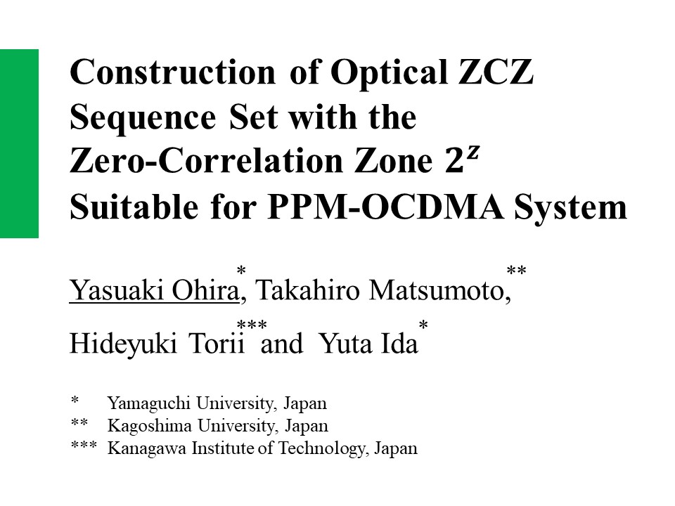 Hello. My name is Yasuaki Ohira, I¡®m from Yamaguchi University in Japan. I'd like to talk about Construction of Optical ZCZ Sequence Set with the Zero-Correlation Zone two to the power of z Suitable for PPM-OCDMA System.