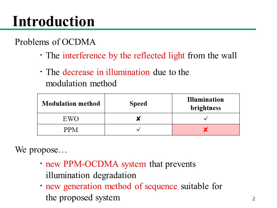 This slide shows introduction of this presentation. We focused on two problems of OCDMA. The first problem is the interference by the reflected light from the wall. This problem occurs when the receiver is located near the wall in a room. The reflected light from the wall causes delay distortion. The delay distortion causes inter-symbol interference (ISI), which degrades the bit error rate performance. The second problem is the decrease in illumination due to the modulation method. The major modulation methods of the OCDMA system are equal weight orthogonal (EWO) modulation and pulse position modulation (PPM). The EWO modulation can transmit only one bit per symbol, which becomes a problem in terms of the speed of communication. On the other hand, the PPM can improve the bit rate by dividing the symbol into multiple slots. However, increasing the number of slots in the PPM-OCDMA means that the LED emission time per symbol becomes shorter, which causes a decrease in the original illumination brightness of the optical product.