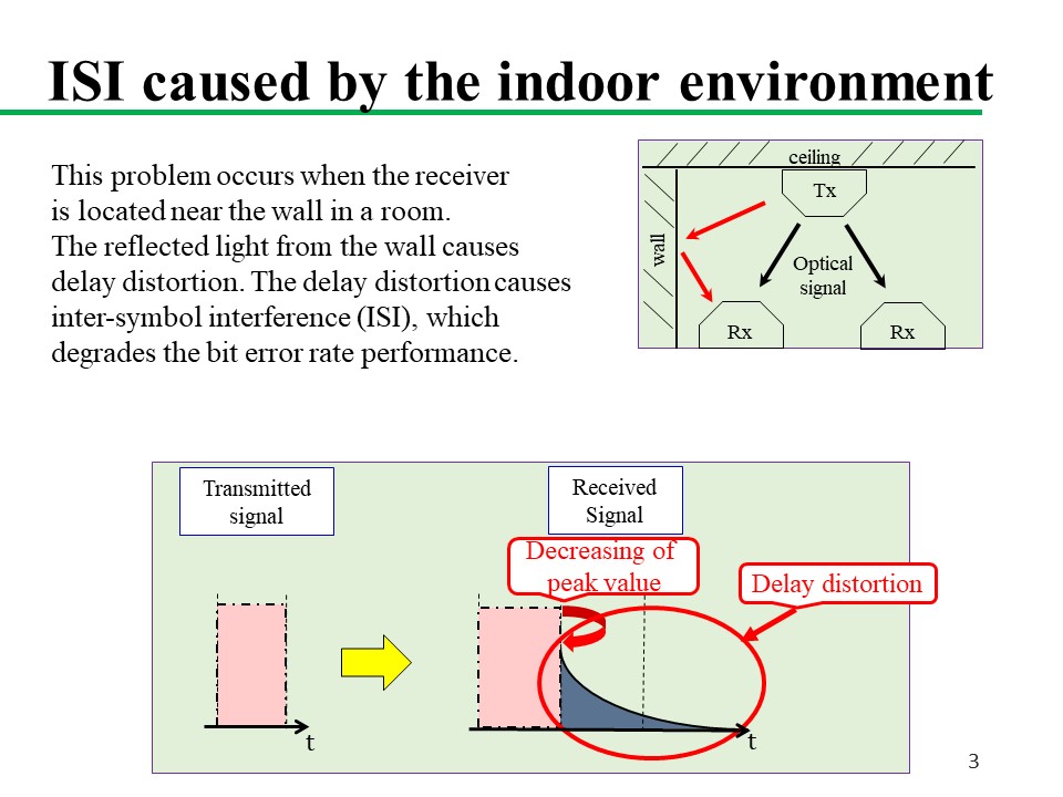 This slide shows inter-symbol interference (ISI) caused by the indoor environment. This problem occurs when the receiver is located near the wall in a room. The reflected light from the wall causes delay distortion. The delay distortion causes ISI, which degrades the bit error rate performance.