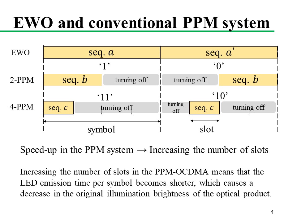 This slide shows EWO and conventional PPM system. The EWO modulation and 2-PPM can transmit only one bit per symbol. The 4-PPM can transmit two bits per symbol. Increasing the number of slots in the PPM-OCDMA means speed-up the communication speed. On the other hand, the LED emission time per symbol becomes shorter, which causes a decrease in the original illumination brightness of the optical product.