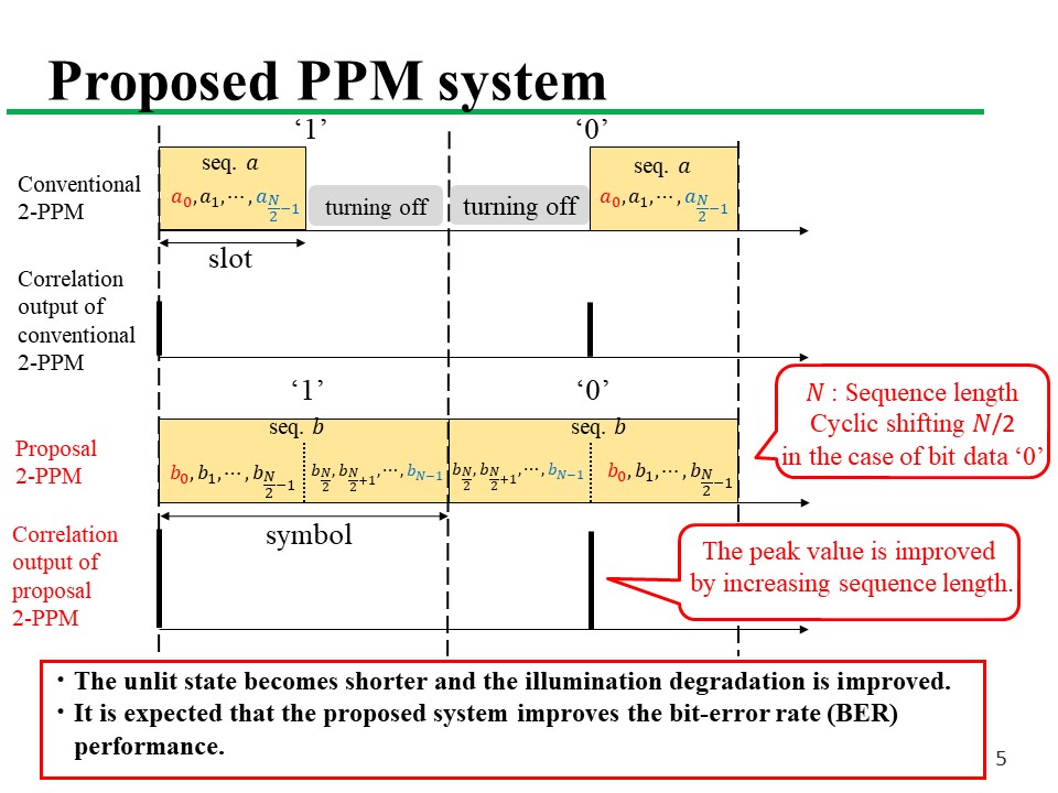 This slide shows Proposed PPM system. The difference between the conventional and proposed systems is the way to change the pulse position. In the conventional system, a spreading sequence with the same length as the slot length is used, and is assigned to a pulse position according to bit data. On the other hand, in the proposed system, a spreading sequence with the same length as the symbol length is used, and the pulse position is changed by cyclic shifting This means that the symbol does not have slots which are unassigned to a spreading sequence. In the proposed PPM system, the unlit state becomes shorter and the illumination degradation is improved. Moreover, it is expected that the proposed system improves the bit-error rate (BER) performance by increasing sequence length.