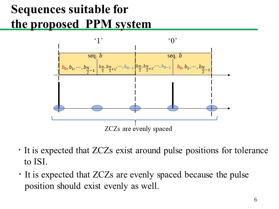 This slide shows sequences suitable for the proposed PPM system. The expected sequence should have two features. First, it is expected that ZCZs exist around pulse positions for tolerance to ISI. Second, it is expected that ZCZs are evenly spaced because the pulse position should exist evenly as well.