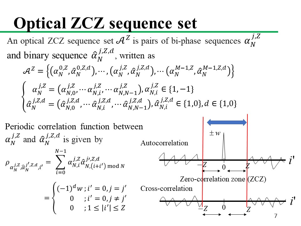 This slide shows the optical ZCZ sequence set and its periodic correlation functions. An optical ZCZ sequence set is a set of pairs of bi‐phase sequences and binary sequences. The element of bi‐phase sequences is either 1 or ‐1. The element of binary sequences is either 1 or 0. A periodic correlation function between a bi‐phase sequence and a binary sequence is given by this equation. Then, this sequence set is called an optical ZCZ sequence set. This figure shows its autocorrelation and cross‐correlation function. Shift 0 is a peak w of the autocorrelation function. On the other hand, the cross‐correlation function is 0 at the shift 0.