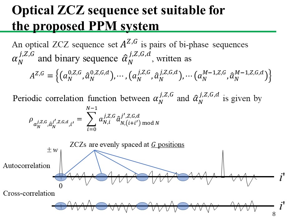 This slide shows the optical ZCZ sequence set suitable for the proposed PPM system. This figure shows its autocorrelation and cross‐correlation function. In the side loves, ZCZs are evenly spaced at G positions.