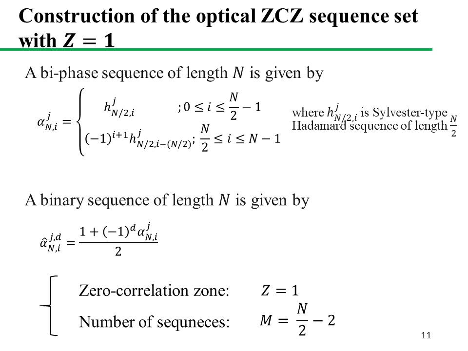 This slide shows construction of optical ZCZ sequence set with Z equals 1 at shift 0. A bi‐phase sequence of length N is given by this equation, where h sub N over two is Sylvester‐type Hadamard sequence of length N over 2. Similarly, a binary sequence of length N is given by this equation. A set of pairs of bi‐phase sequences and binary sequences is an optical ZCZ sequence set with Z equals 1, and Number of sequences M equals N over 2 minus 2.