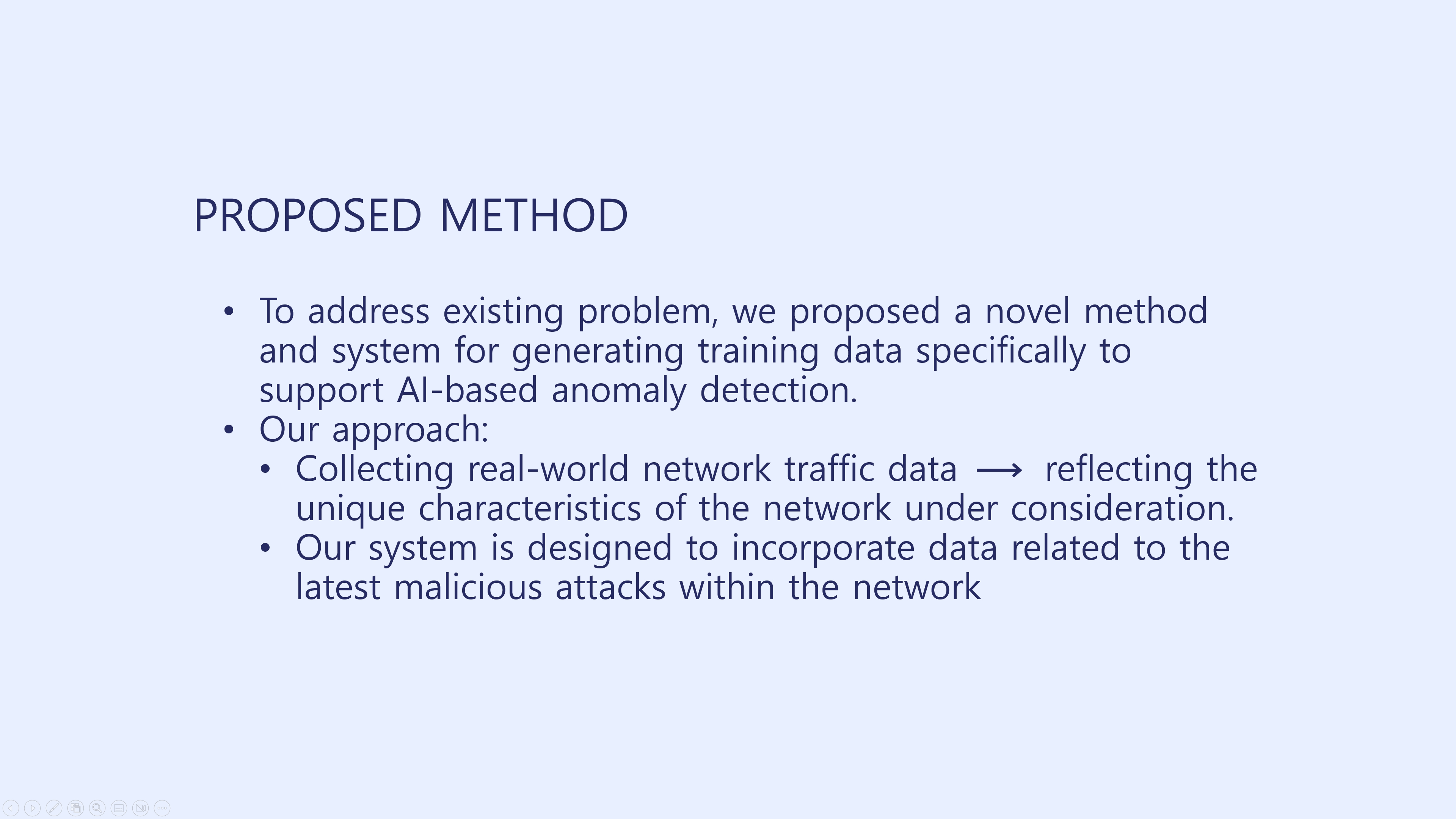 To address the existing problem, we proposed a novel method and system for generating training data to support AI-based anomaly detection. Our approach is grounded in collecting real-world network traffic data, offering a distinct advantage in accurately reflecting the unique characteristics of the network under consideration. Furthermore, our system is designed to incorporate data related to the latest malicious attacks within the network, ensuring that AI-based anomaly detection methods are well-equipped to handle the dynamic nature of cybersecurity threats.