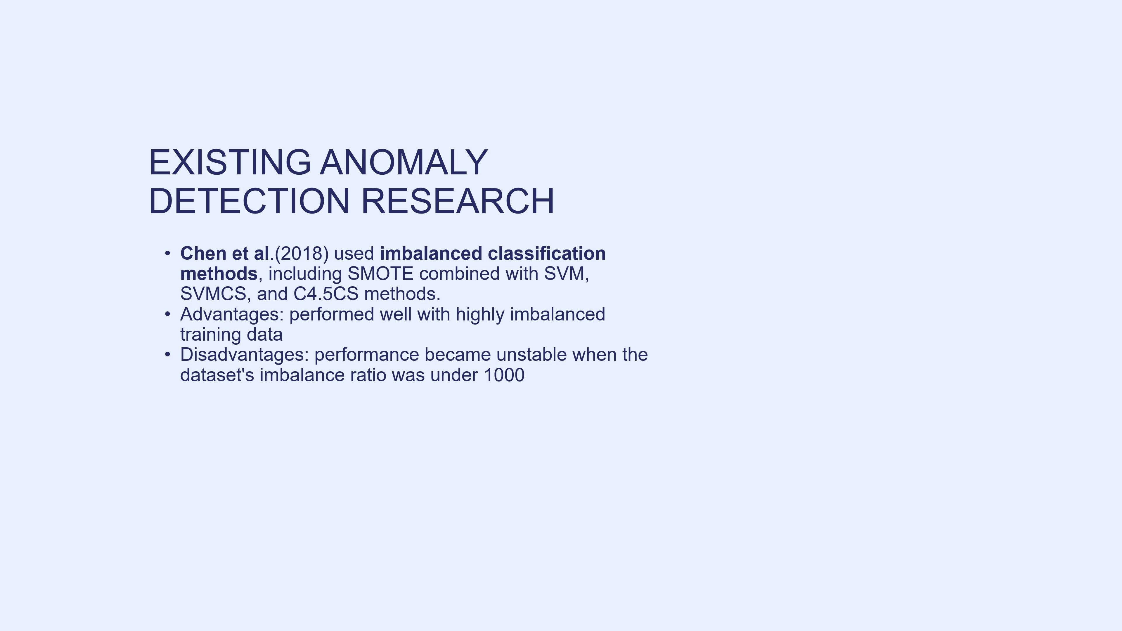 Chen et al. analyzed network traffic and employed machine learning methods to identify abnormal behavior and detect malicious apps. They used imbalanced classification methods, including the Synthetic Minority Oversampling Technique combined with Support Vector Machine, SVM Cost-Sensitive, and C4.5 Cost-Sensitive methods. While this approach performed well with highly imbalanced training data, its performance became unstable when the dataset's imbalance ratio was under 1000.