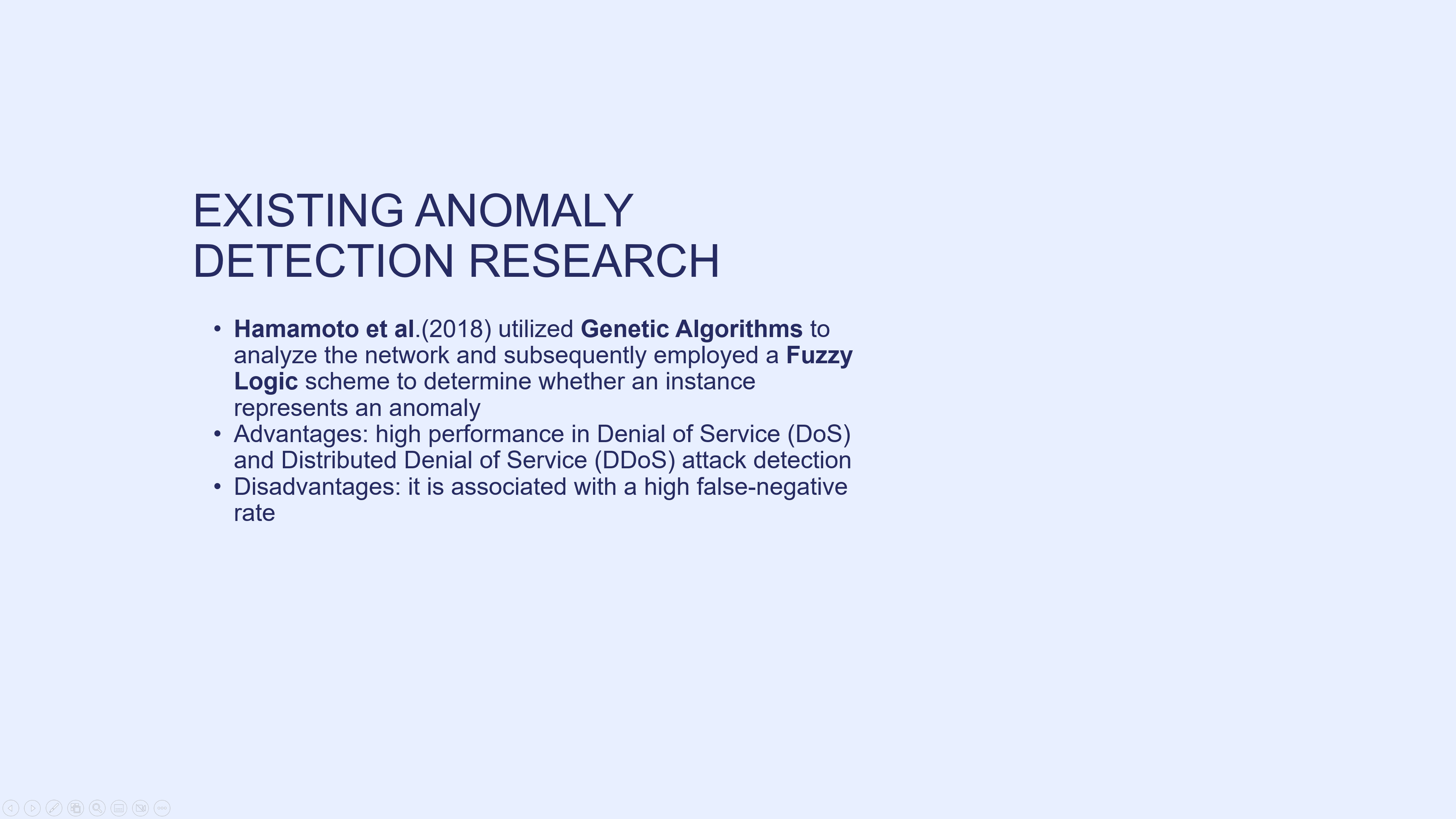 Hamamoto et al. utilized Genetic Algorithms to analyze the network and subsequently employed a Fuzzy Logic scheme to determine whether an instance represents an anomaly. This method exhibits high performance in Denial of Service and Distributed Denial of Service attack detection, but it is associated with a high false-negative rate.