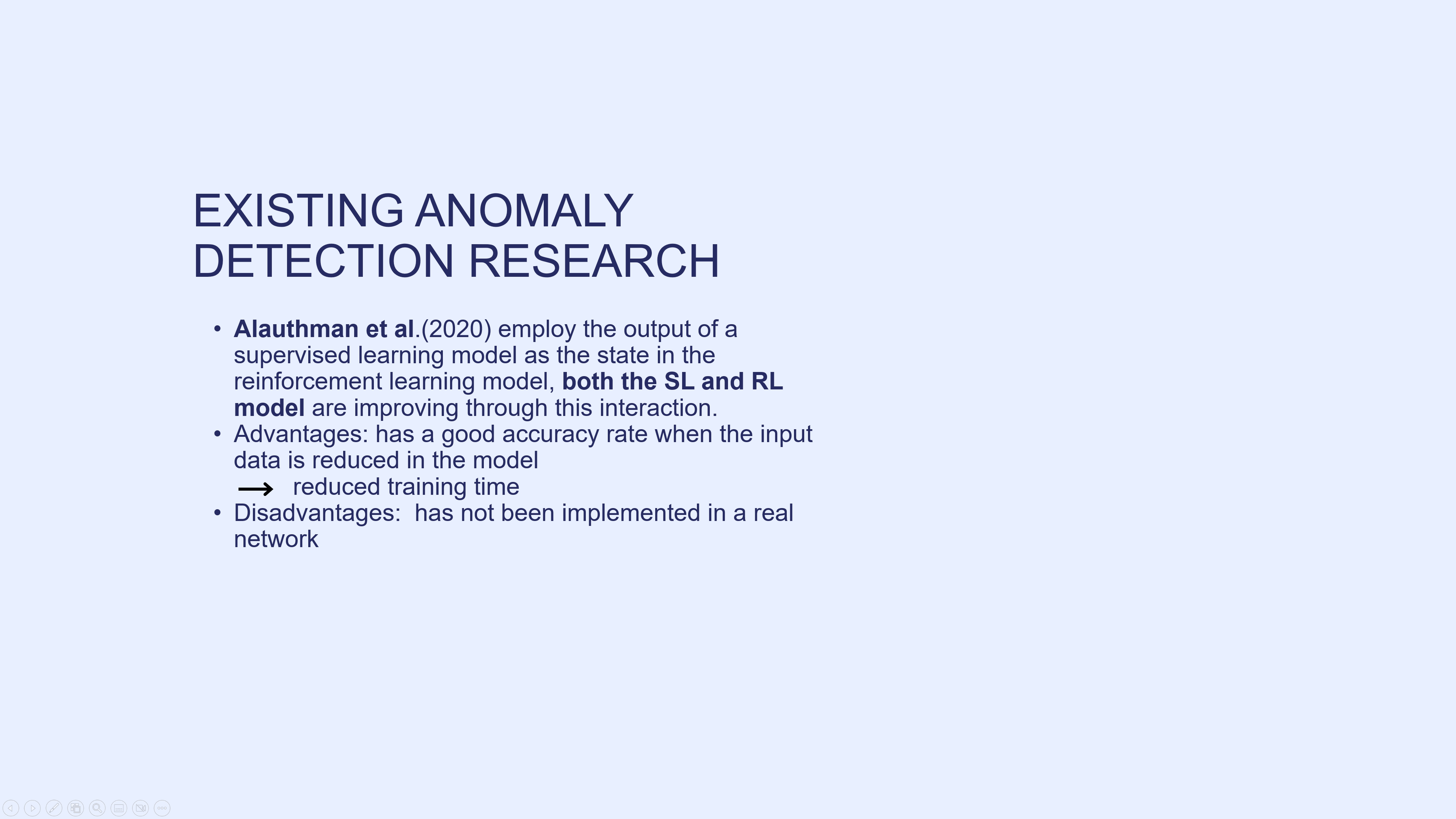 Alauthman et al. employ the output of a supervised learning model as the state in the reinforcement learning model, both the SL and RL model are improving through this interaction. This method has a good accuracy rate when the input data is reduced in the model, leading to reduced training time. However, it has been validated in MATLAB using three datasets and has not been implemented in a real network.