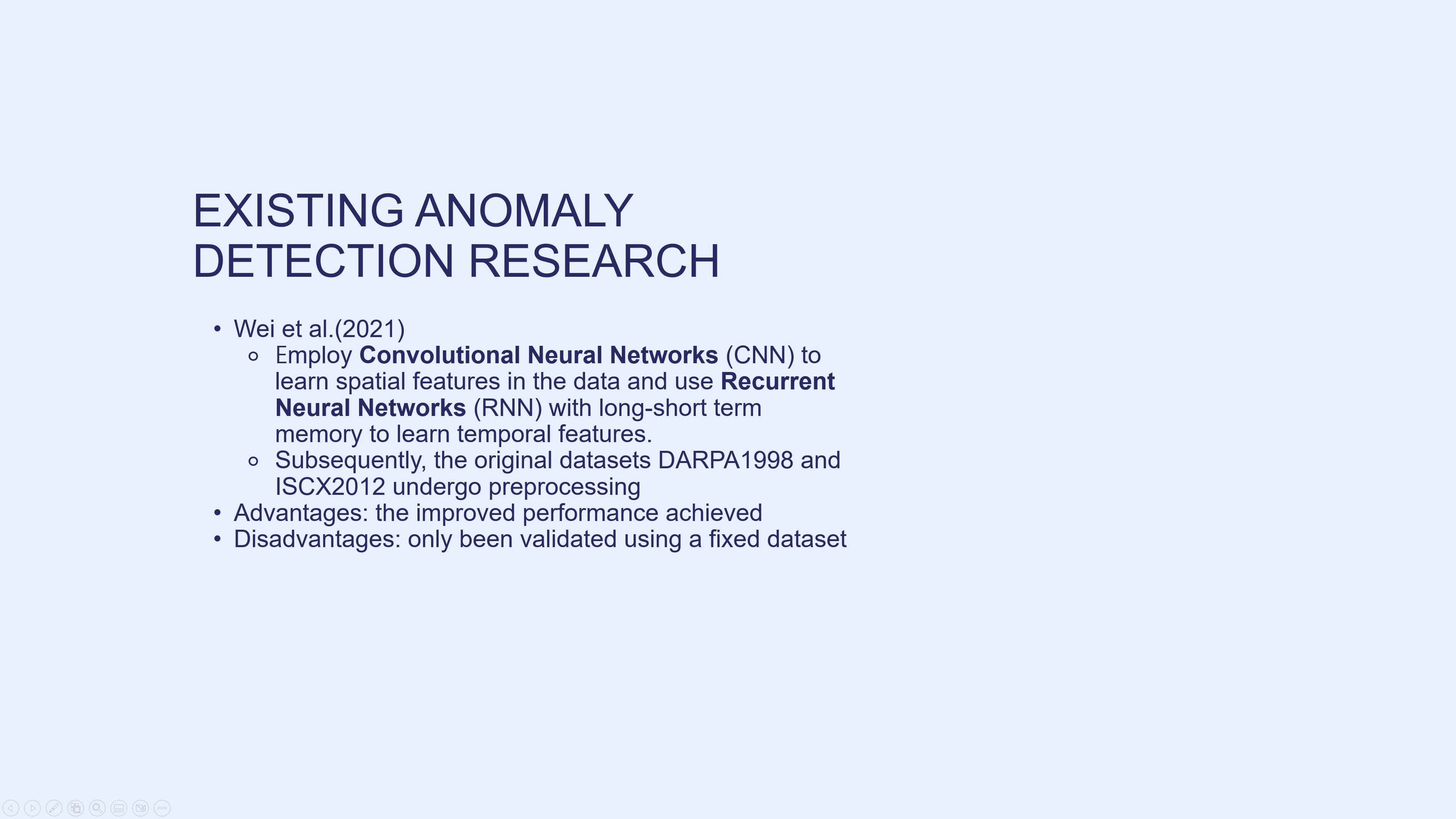 Wei et al. employ Convolutional Neural Networks to learn spatial features in the data and use Recurrent Neural Networks with long-short term memory to learn temporal features. Subsequently, the original datasets DARPA1998 and ISCX2012 undergo preprocessing. The advantage is the improved performance achieved, this approach has only been validated using a fixed dataset, which can be considered a limitation.
