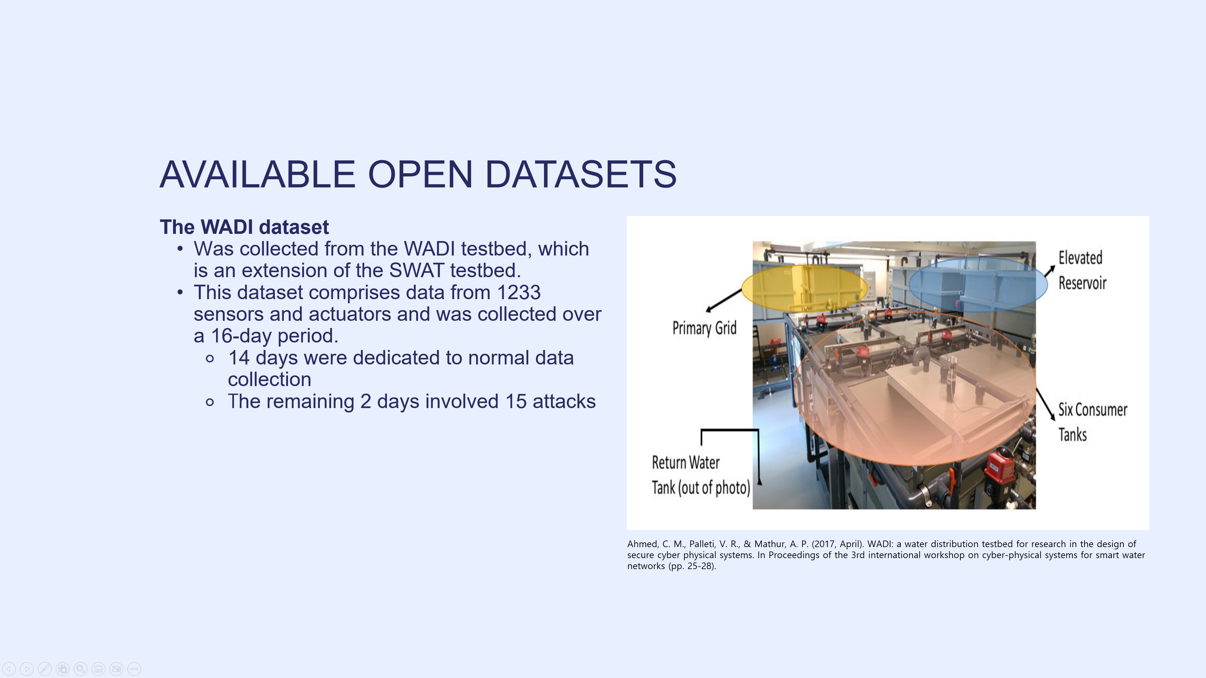 The WADI dataset was collected from the WADI testbed, which is an extension of the SWAT testbed. This dataset comprises data from 1233 sensors and actuators and was collected over a 16-day period. Of these 16 days, 14 days were dedicated to normal data collection, while the remaining 2 days involved 15 attacks.