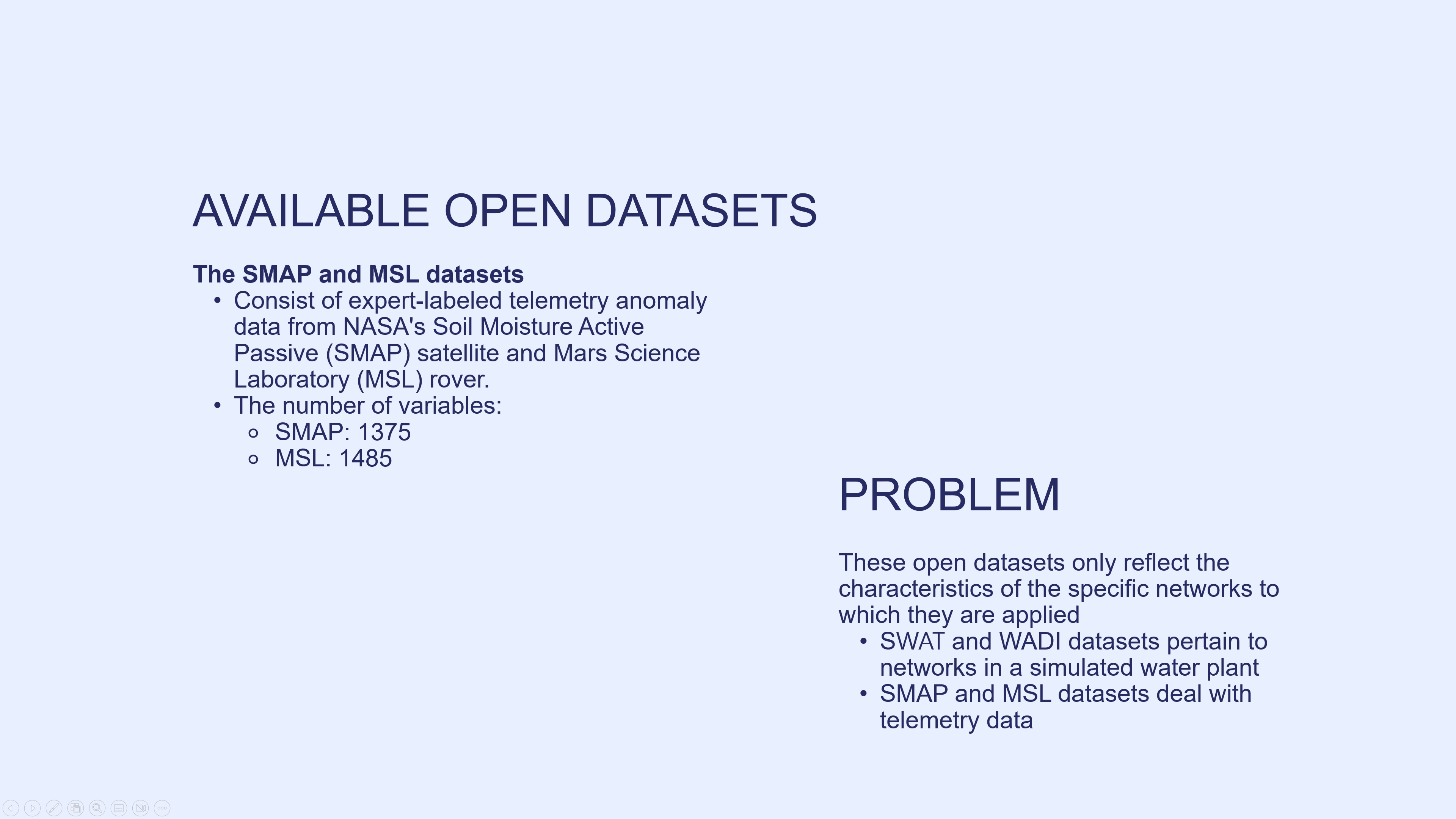 The SMAP and MSL datasets consist of expert-labeled telemetry anomaly data from NASA's Soil Moisture Active Passive satellite and Mars Science Laboratory rover. The number of SMAP variables is 1375, while the that of MSL features is 1485, making them significantly more extensive compared to single-entity datasets. These open datasets only reflect the characteristics of the specific networks to which they are applied. While SWAT and WADI datasets pertain to networks in a simulated water plant, SMAP and MSL datasets deal with telemetry data.