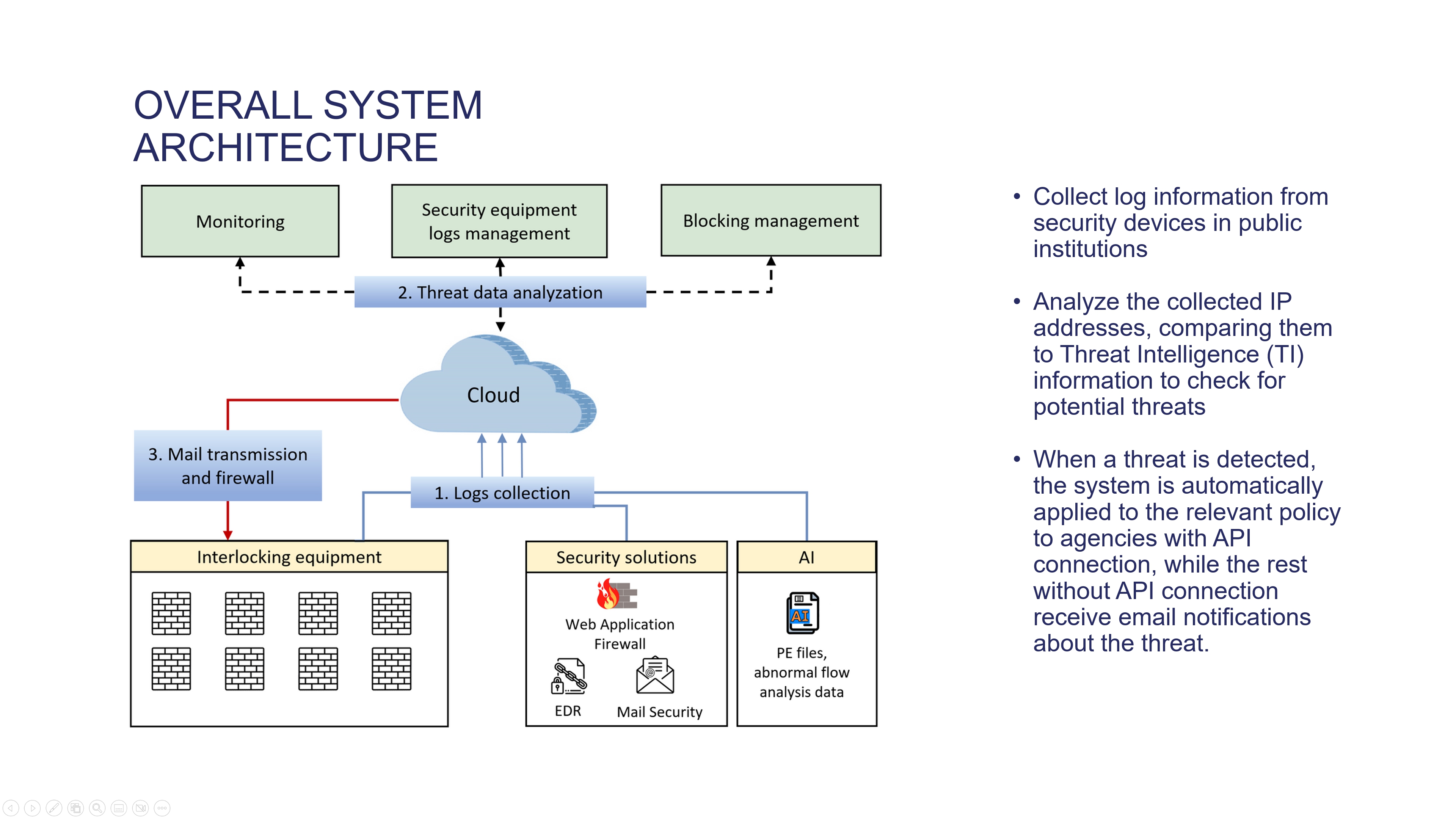 The core of our system revolves around a three-step process described in this figure. First, we collected log information from security devices in public institutions. Then, we analyzed the collected IP addresses, comparing them to Threat Intelligence (TI) information to check for potential threats. When a threat is detected, the system is automatically applied to the relevant policy to agencies with API connection, while the rest without API connection receive email notifications about the threat.