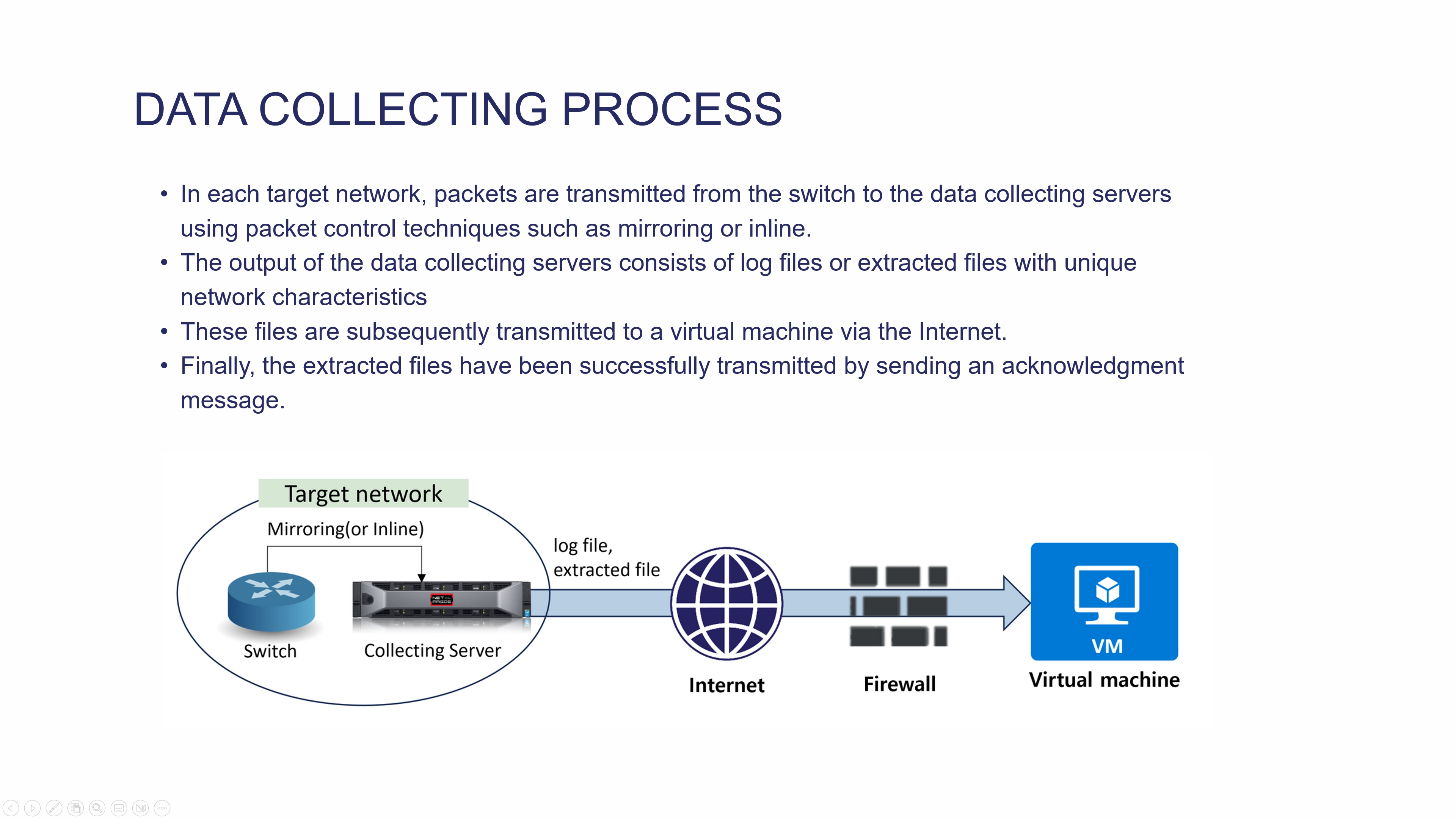 The data collecting process is described this Figure. In each target network, packets are transmitted from the switch to the data collecting servers using packet control techniques such as mirroring or inline. The output of the data collecting servers consists of log files or extracted files with unique network characteristics. These files are subsequently transmitted to a virtual machine via the Internet. Before being sent to the virtual machine, a firewall is configured to receive only the traffic directed to a specific port number and the IP address of the collection sensor associated with the relevant agency. Finally, the extracted files have been successfully transmitted by sending an acknowledgment message.
