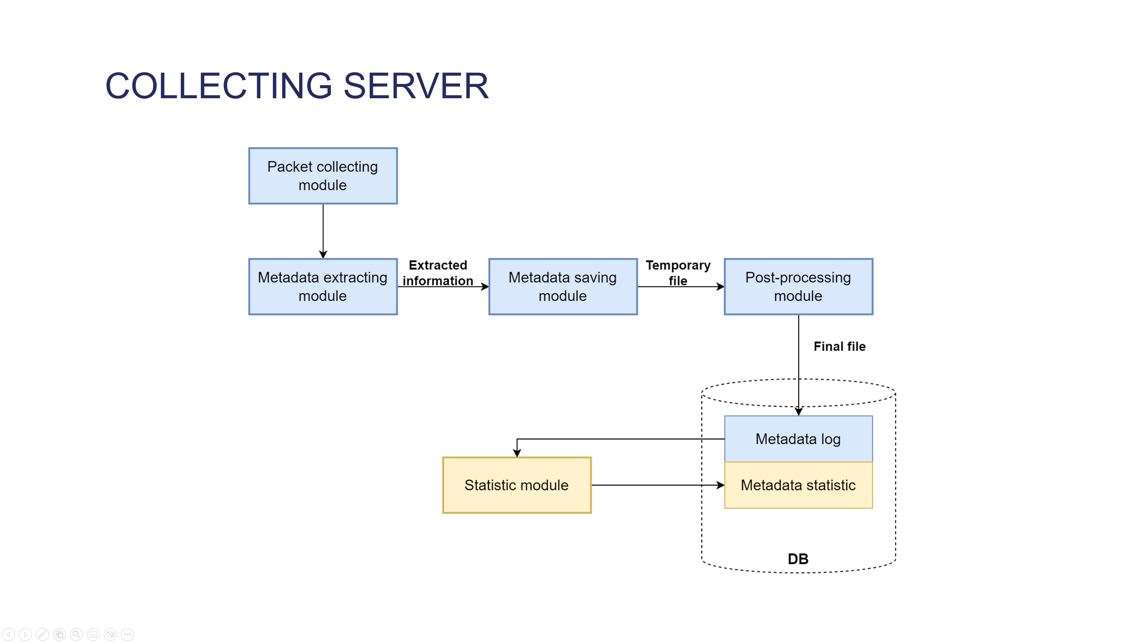 The core of our system is the data collecting process that takes place at the collecting server. Packets are transmitted from the Packet Collecting module to the Metadata extracting module, where the network traffic is analyzed. This process extracts application protocols and information of flow, including IP addresses, port numbers, packet counters, and additional details corresponding to the protocol type. The output of Metadata extracting module, in the form of a string (raw data), is transmitted through a pipeline and stored in a temporary file in minutes. During the data processing, this temporary file is read, and the timestamp is converted to UNIX time format. After removing any abnormal lines, such as those lacking proper newline delimiters, the information is saved to a final file, and the temporary file is deleted. Statistical information regarding the extracted protocols is updated on a minute-by-minute basis.