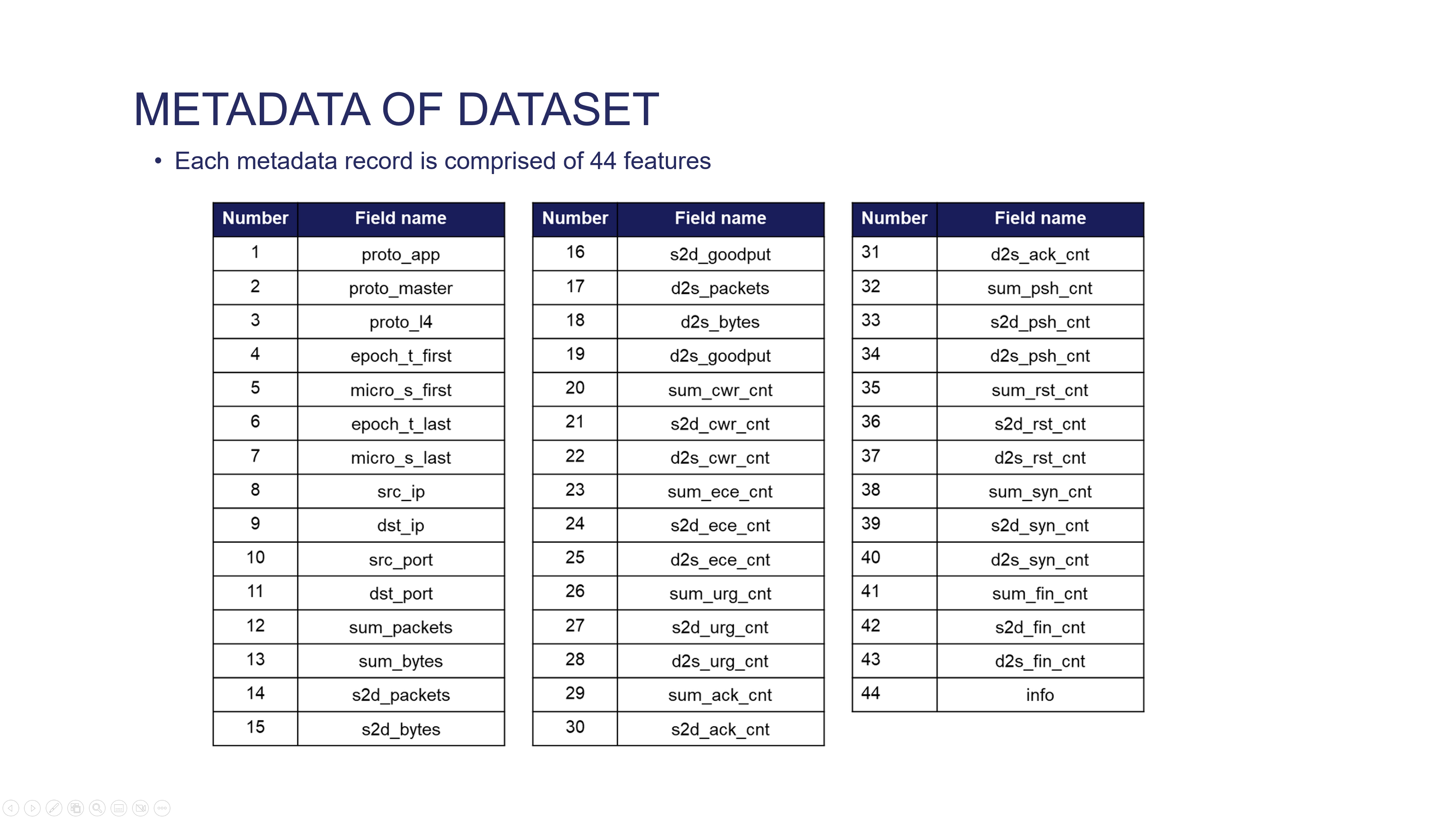 Each metadata record is comprised of 44 features. Features 1-3 explain the primary protocol, sub-protocol, and Layer 4 protocol. Features 4-7 pertain to flow start and end times in seconds and sub-seconds. Information about the IP addresses and port numbers of both the source and destination is provided in features 8-11. Features 12-19 provide information regarding the number of packets, packet size, and actual valid data throughput in both directions (source to destination and vice versa, destination to source). Features 20-41 represent the count of packets with specific flags, such as TCP Congestion Window Reduced, ECN-Echo, Urgent, Acknowledge, Push, Reset, Synchronized Sequence Numbers, and the Finish flag, enabled within the flow, in each direction from source to destination and from destination to source. Additional flow-related information is provided in the final feature.