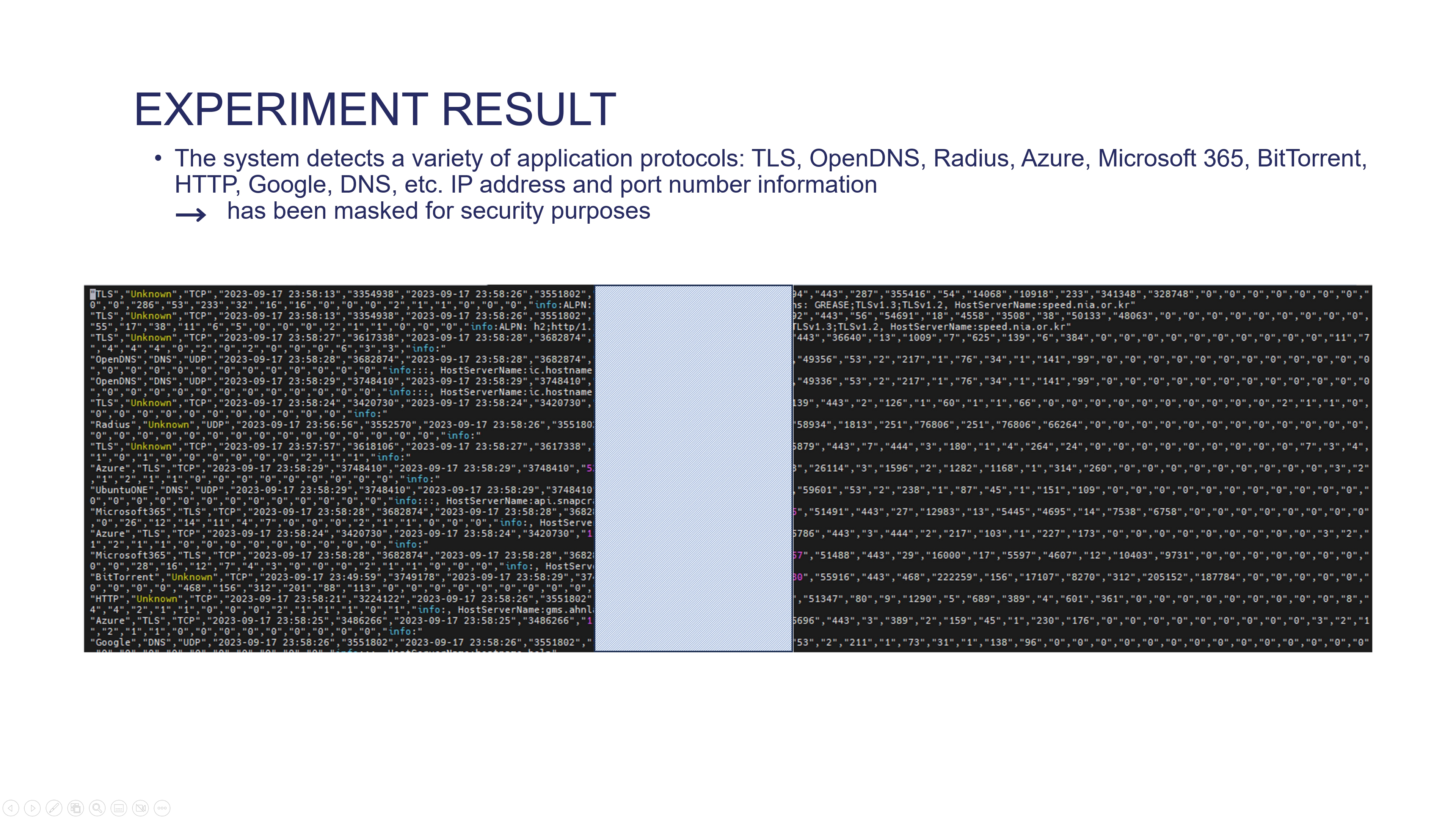 Real data collection is illustrated below. The system detects a variety of application protocols, including TLS, OpenDNS, Radius, Azure, Microsoft 365, BitTorrent, HTTP, Google, DNS, etc. IP address and port number information has been masked for security purposes. Actual traffic information is retained for the training of AI-based anomaly detection models.