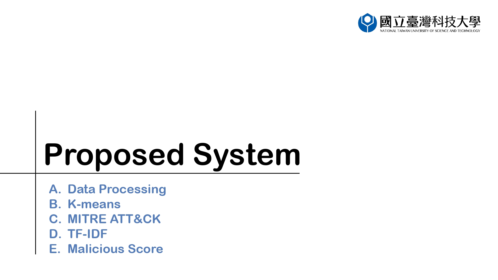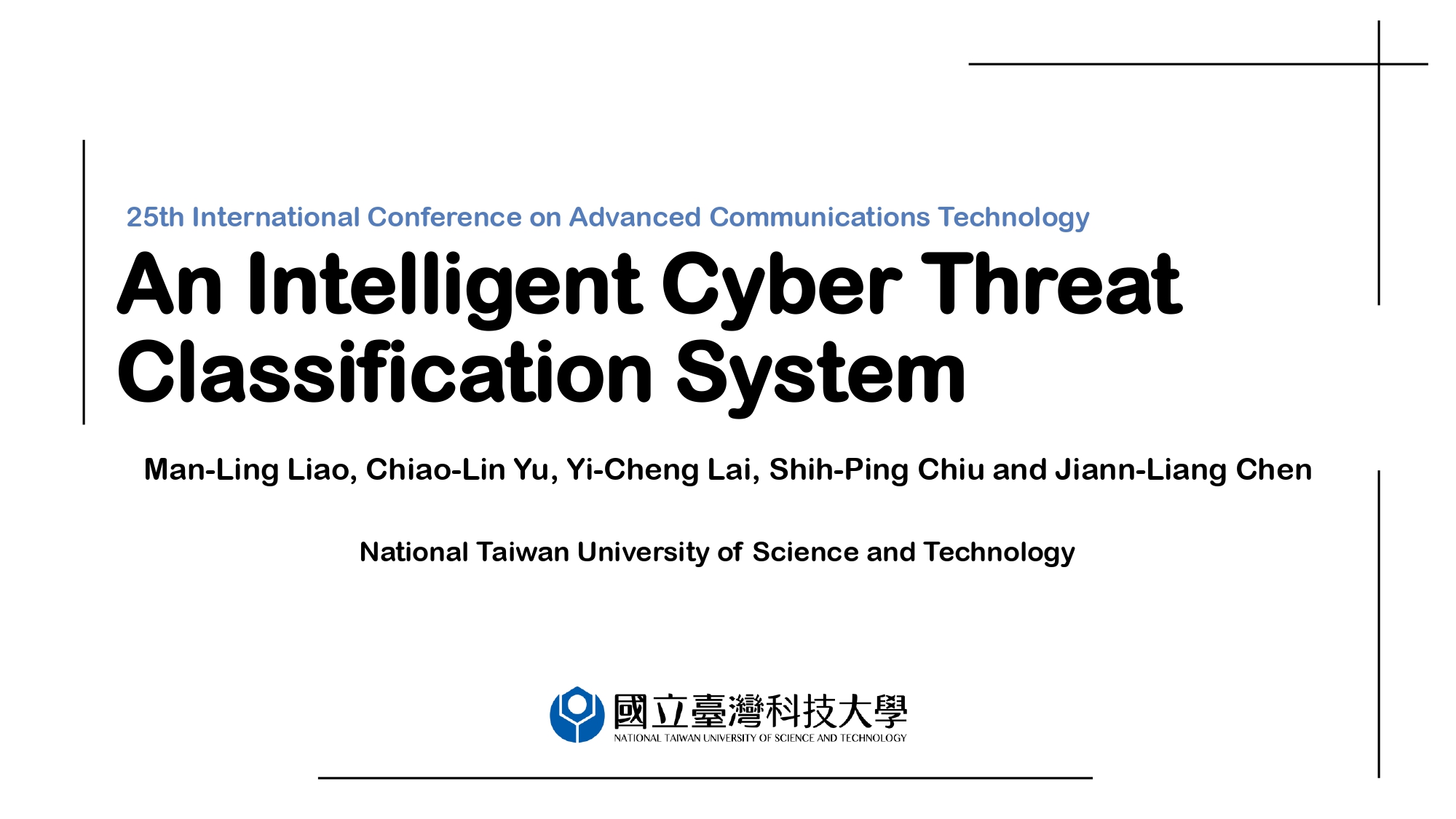 Hello, everyone. My name is Man Ling, Liao. I¡¯m from National Taiwan University of Science and Technology. Today I¡¯m happy to present our work, An Intelligent Cyber Threat Classification System. |