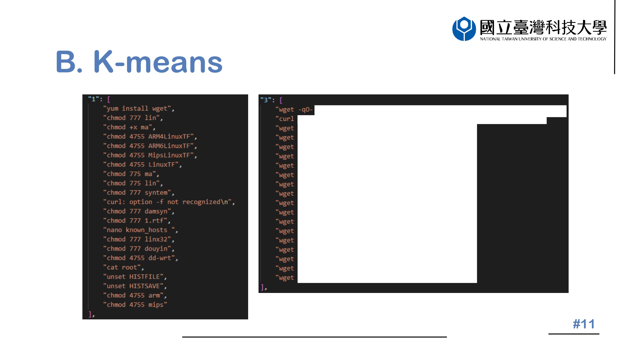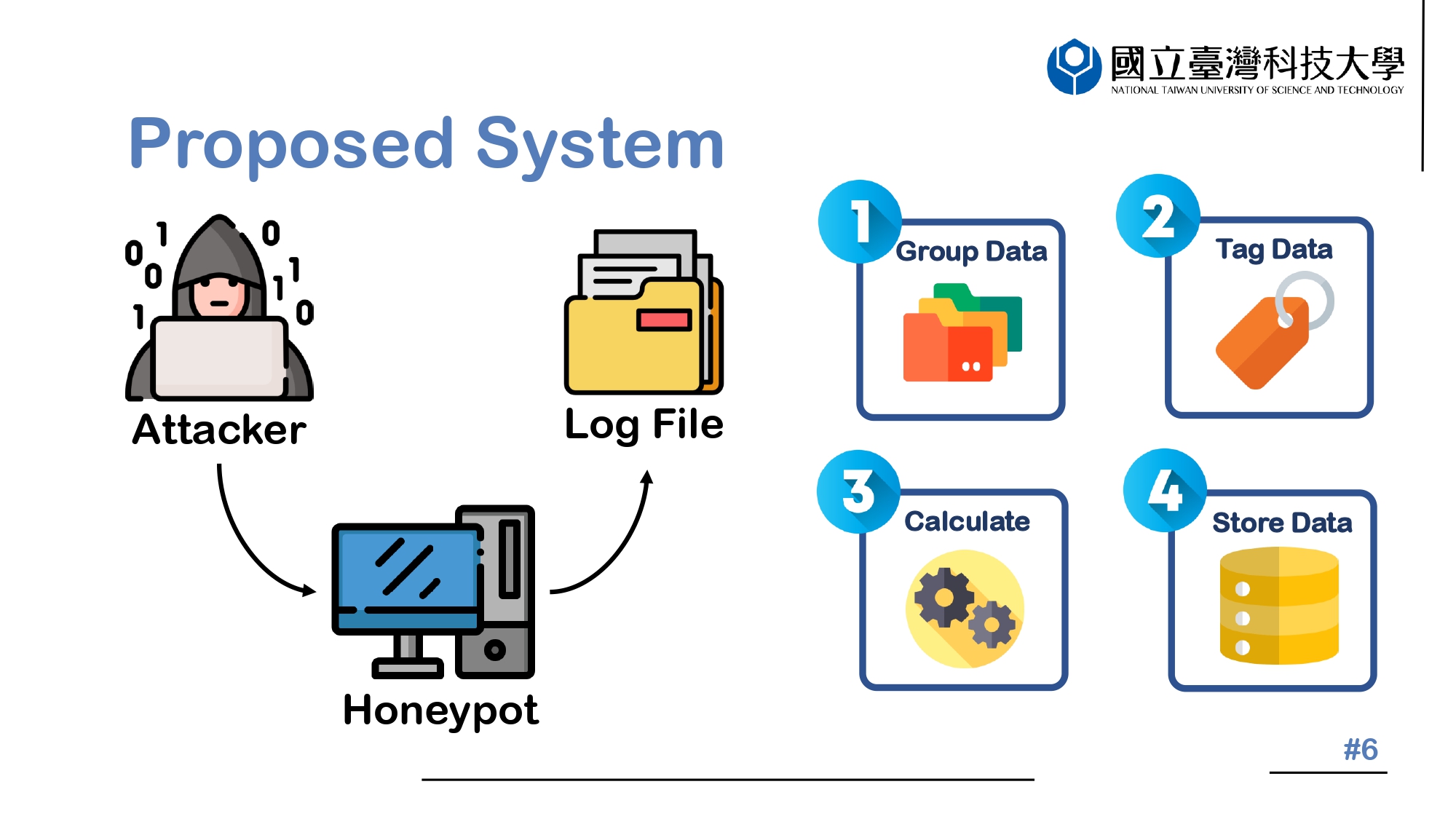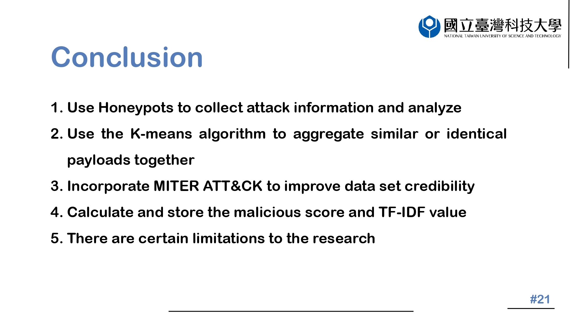 In conclusion, we have developed a system that integrates data analysis, machine learning, manual labeling, TFIDF weighting techniques, and a malicious score. The use of K-means algorithms and MITRE ATT&CK TTP tags allows for quick identification of high-threat attacks, which is valuable for further research. Furthermore, dividing large-scale attacks into smaller groups helps with data labeling, enabling systematic categorization and storage of data as Session Table. Although the proposed system achieved a clustering accuracy of 99.5%, and the source is labeled to provide a reliable dataset with realistic examples, the experiments in this study are not applicable to other situations. |