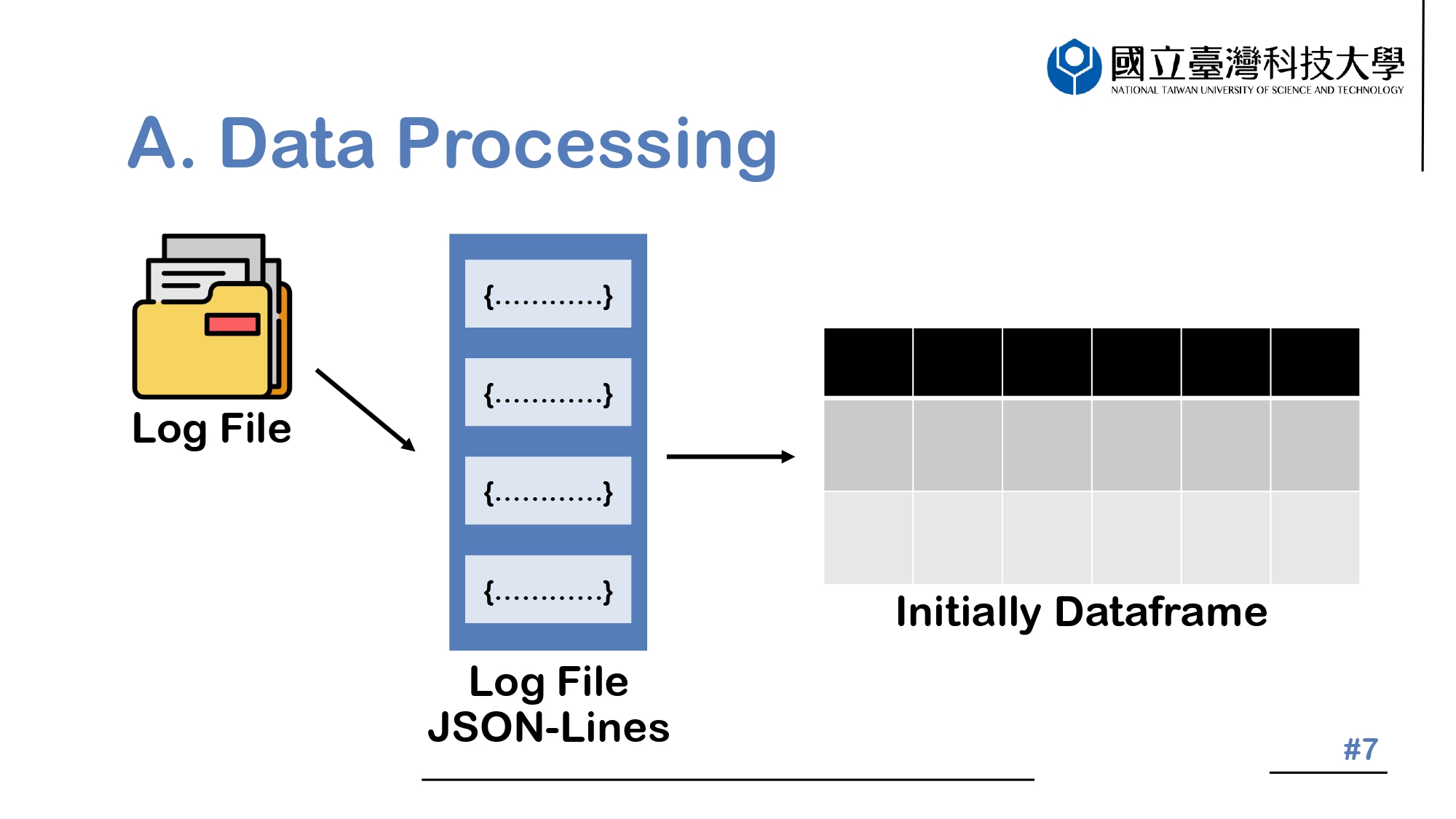 The Log File is presented in JSON-format in the Data Processing area. In order to make it easier to understand and interpret, we will first need to clean up the file and organize it into a Dataframe format. |