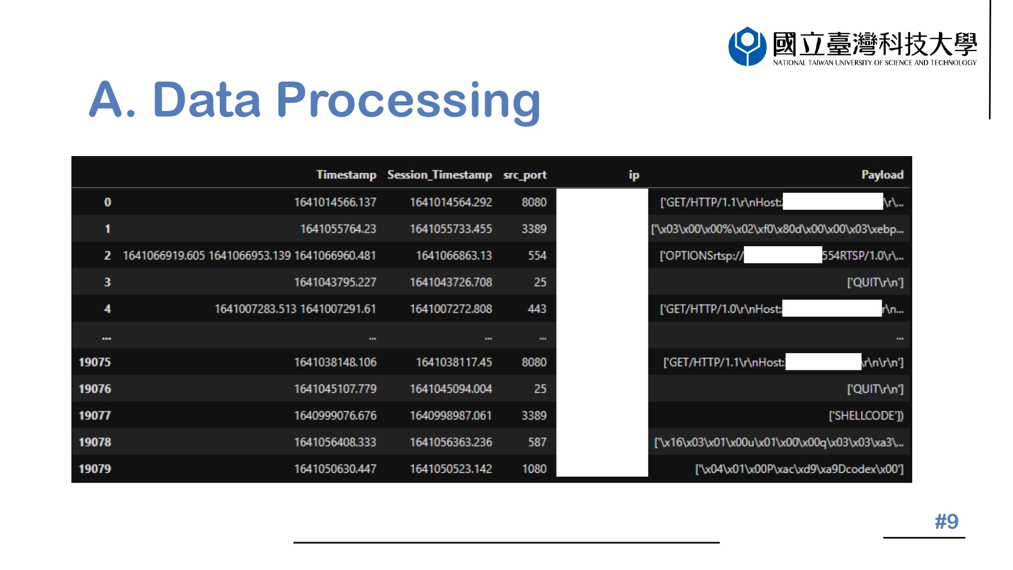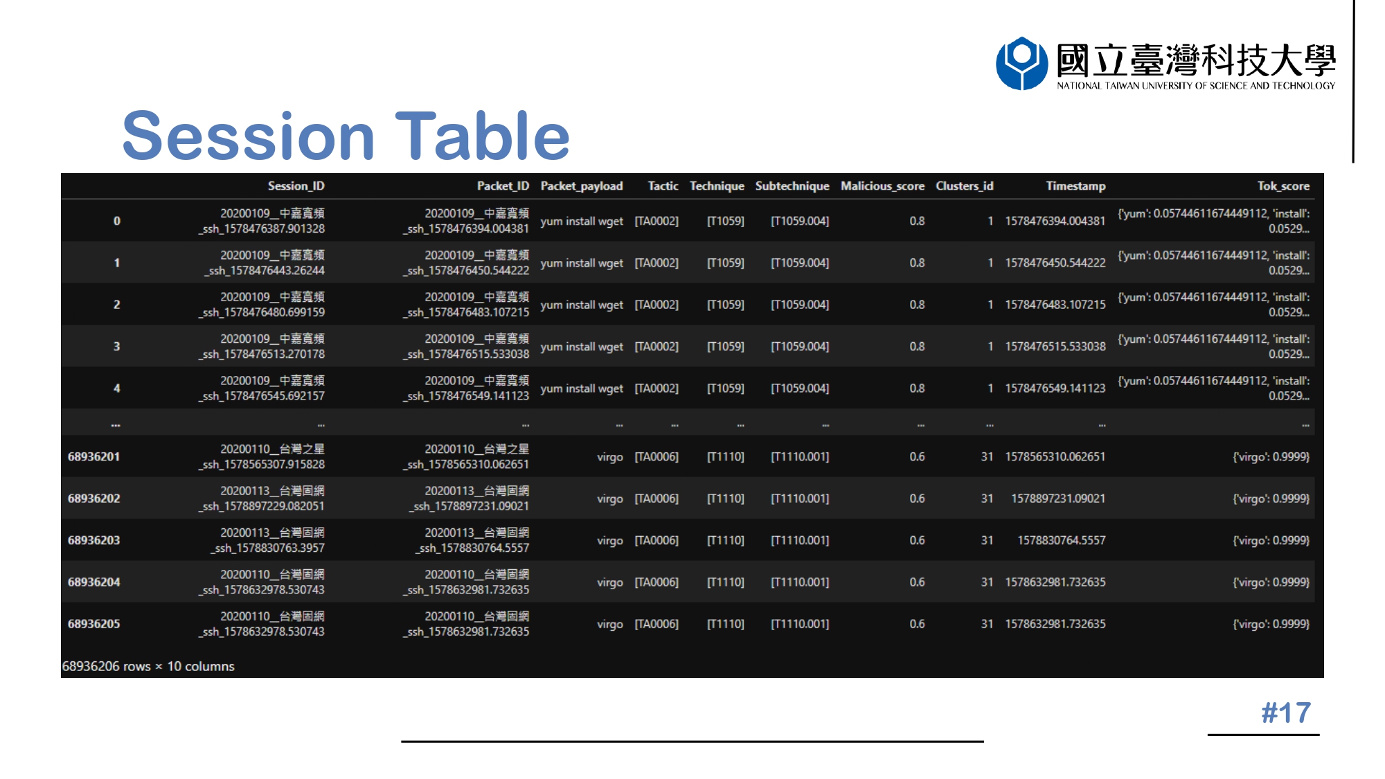 First, let's briefly describe the entire process. We set up a Honeypot to collect information from attackers, and the collected data is formed into multiple clusters using the K-means algorithm. Then, the attributes of each cluster are manually tagged through MITRE ATT&CK. The TF-IDF value of each payload is calculated, and the tagged data, data-related information, and TF-IDF calculation score are saved in the Session Table. |