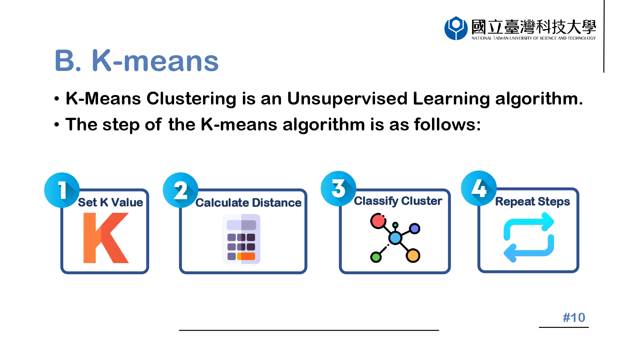 The processing flow includes the following: 1. The parameter K is first set, used as the number of cluster centers in the vector. 2. The cluster center is scattered in the vector space for each data. Calculate the shortest Euclidean distance between each data to all cluster centers. 3. Take the cluster with the shortest distance for each data and classify it as that. 4. Finally, repeat steps 2 and 3. Finish until all data points stay the same from the cluster center.