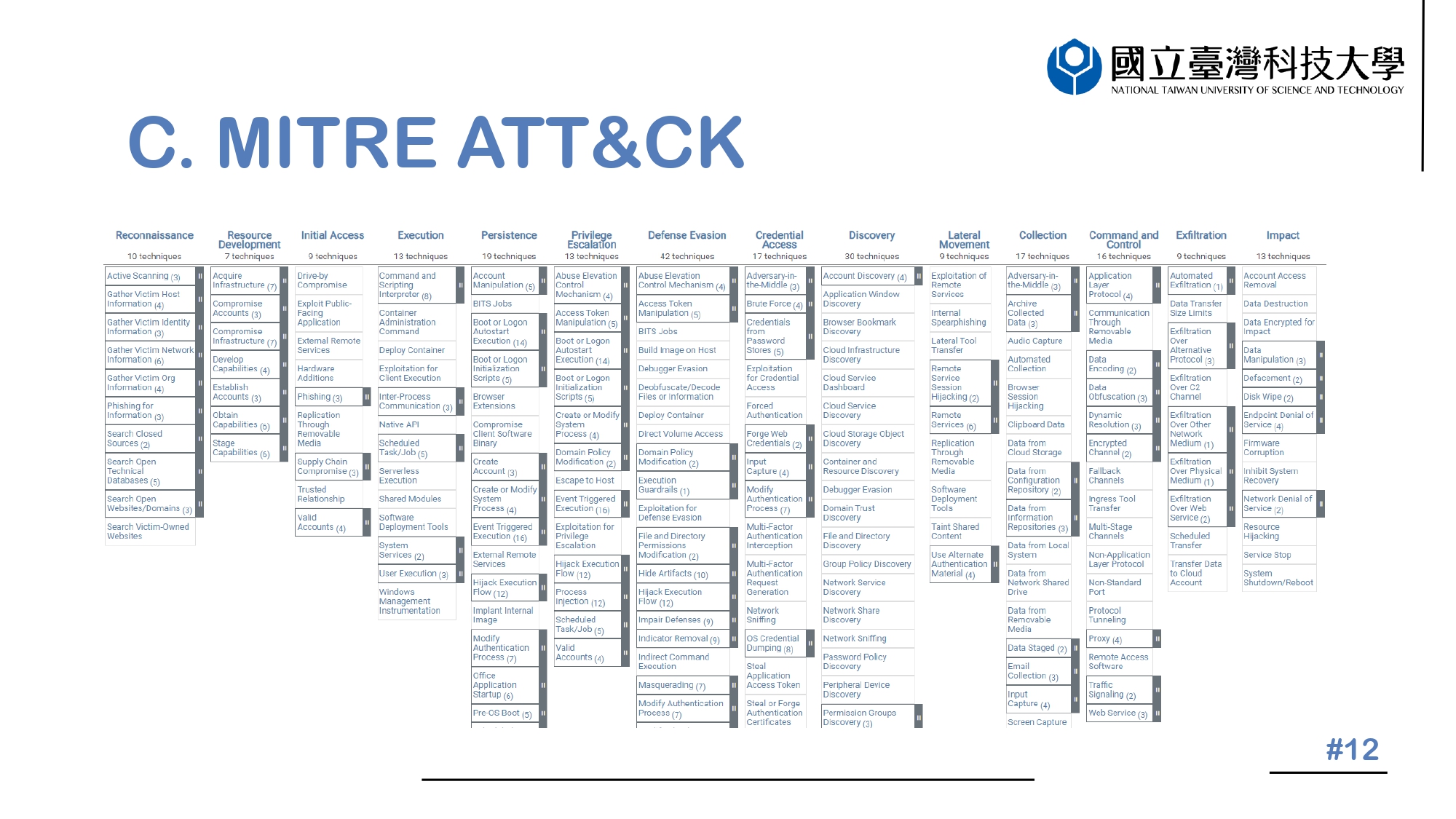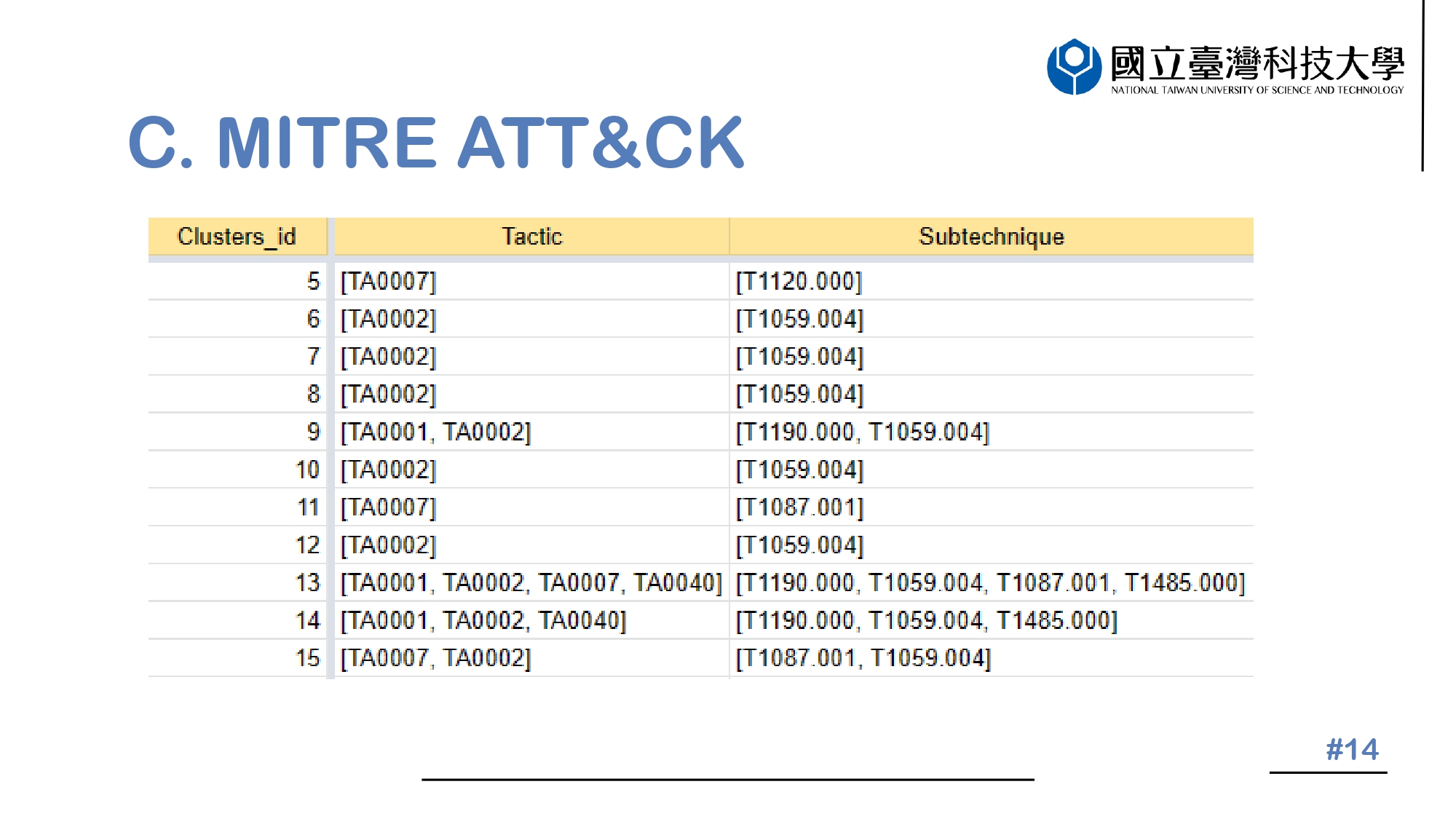 To label attack behavior, we use MITER ATT&CK. MITER ATT&CK is a knowledge base that shares cyber adversary behavior and attack lifecycle. It will be updated regularly with new types of attacks, which allows it to represent classified attacks more systematically. In MITER ATT&CK matrix, attack methods are classified by tactics, subtechniques, and procedures, or TTP for short, which can let security researchers easily recognize suspicious behavior. Our system also uses MITER ATT&CK TTP to label the attack behavior. |