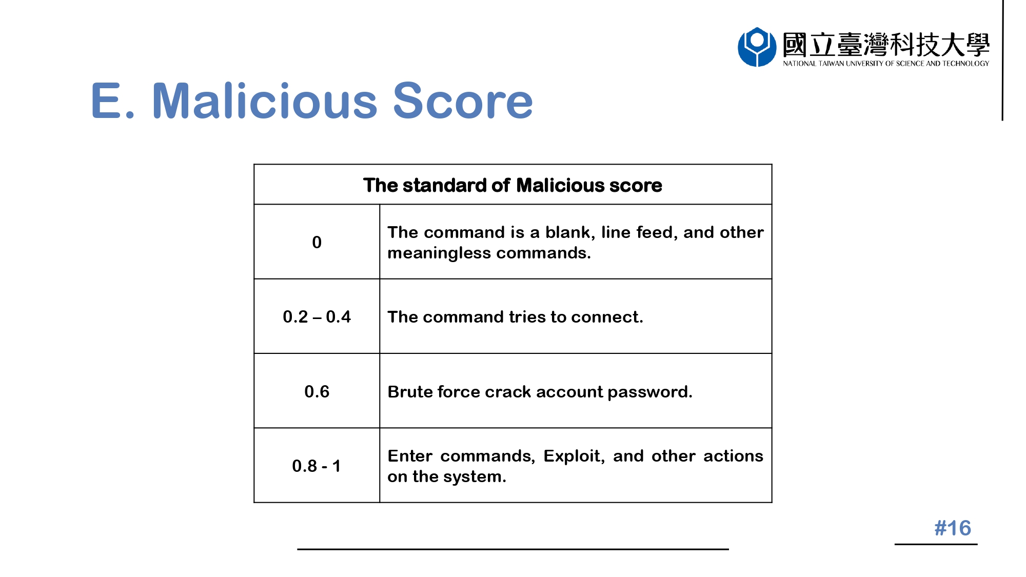 Each group is assigned a malicious score that reflects the level of harm it poses. To ensure a consistent and accurate evaluation, a unified standard for the malicious score has been established by a collaboration of personnel from three separate institutions in Taiwan. The criteria for each score is presented as follows. |
