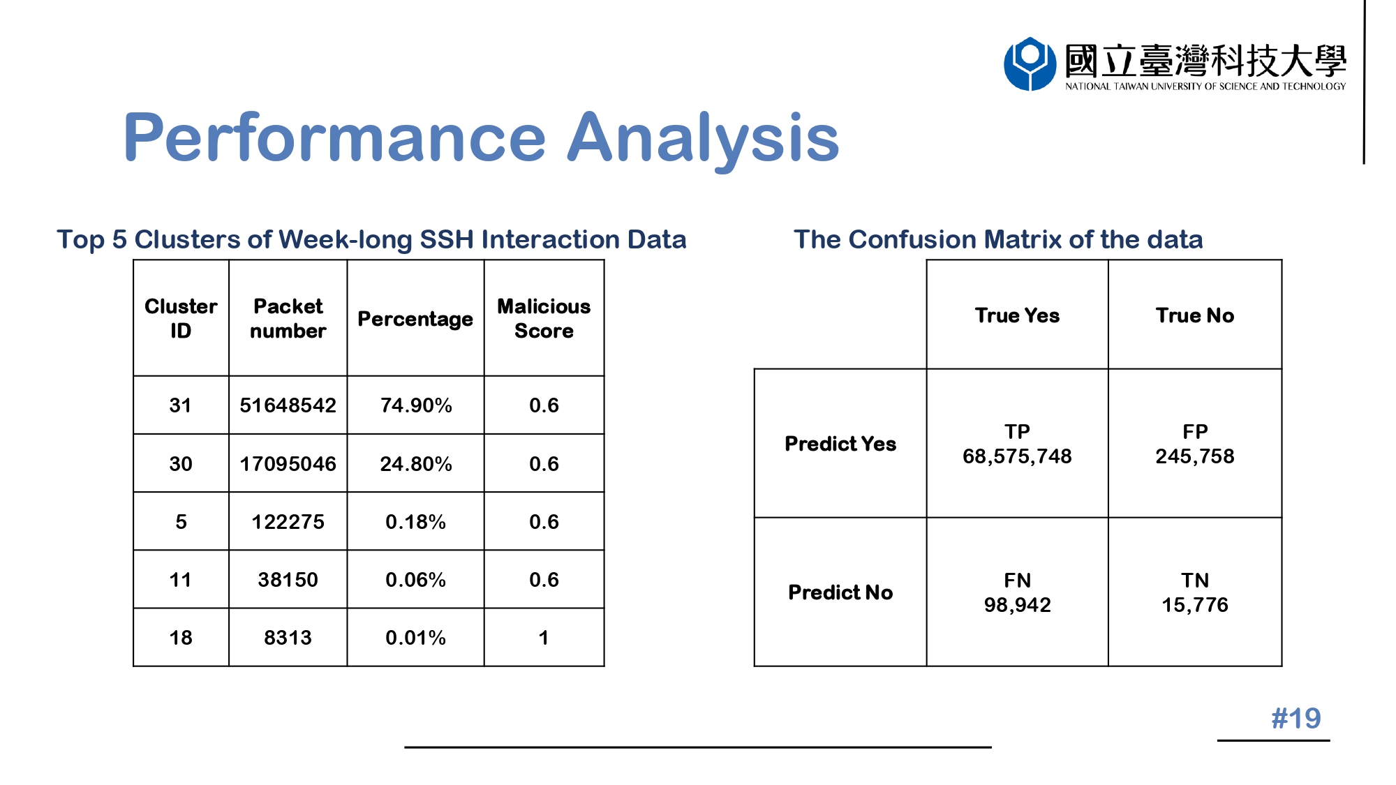 On the right is the confusion matrix of the data through the K-means algorithm. TP stands for the number of packets that are accurately clustered after the algorithm, FP for the number of packets wrongly clustered, FN for the number of packets that could not be clustered but could be classified into clusters after the algorithm's judgement, and TN for the number of packets that could not be clustered after the algorithm's judgement.