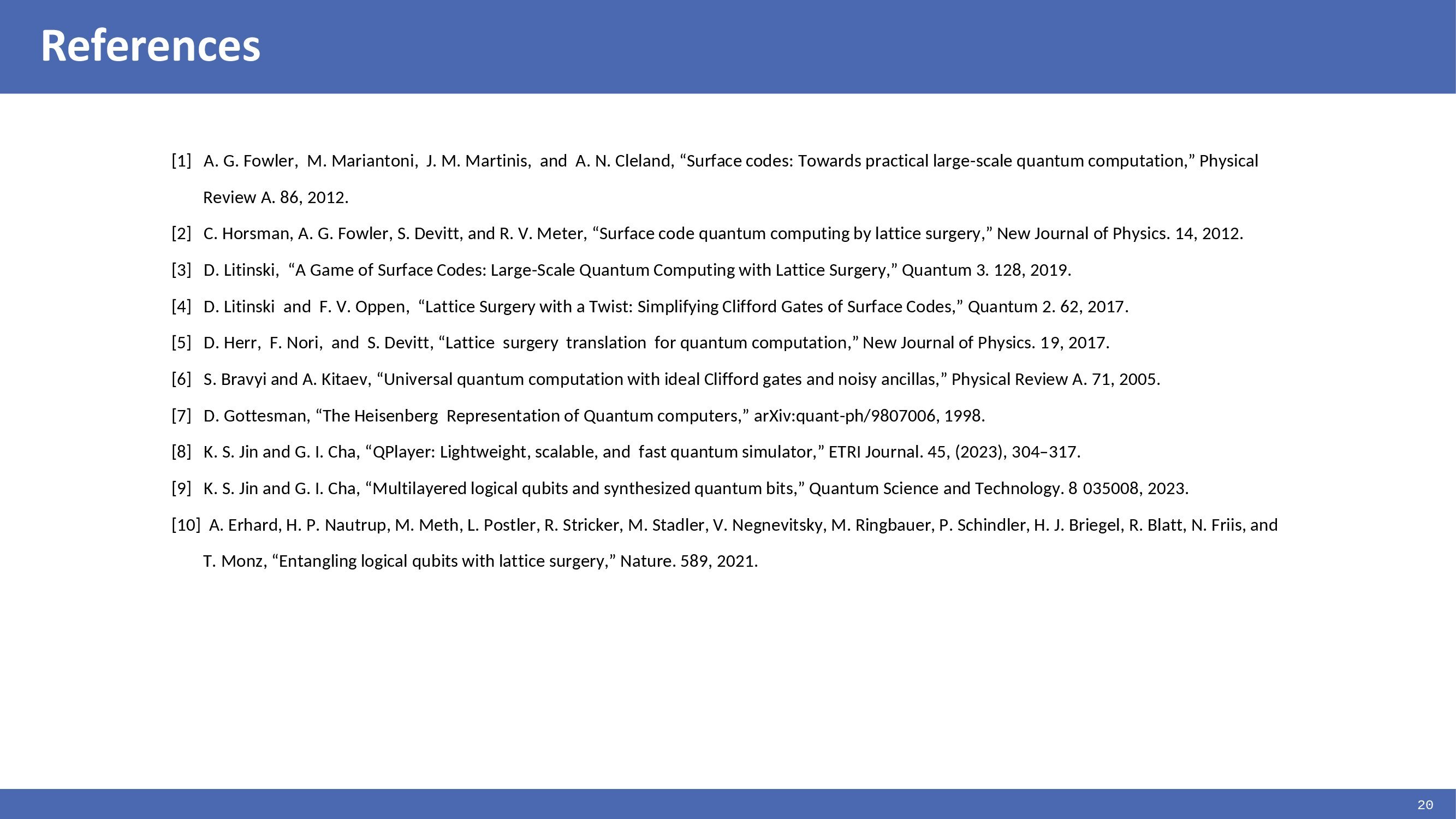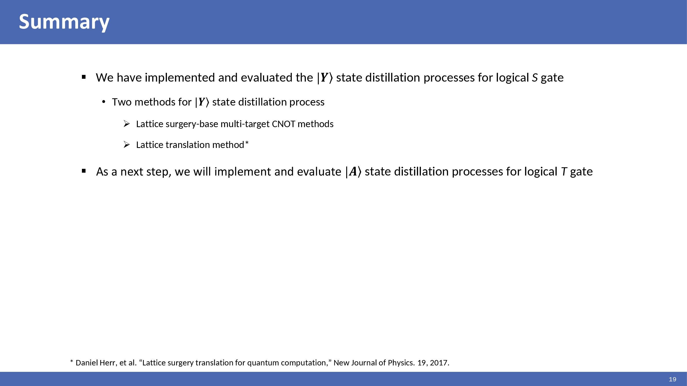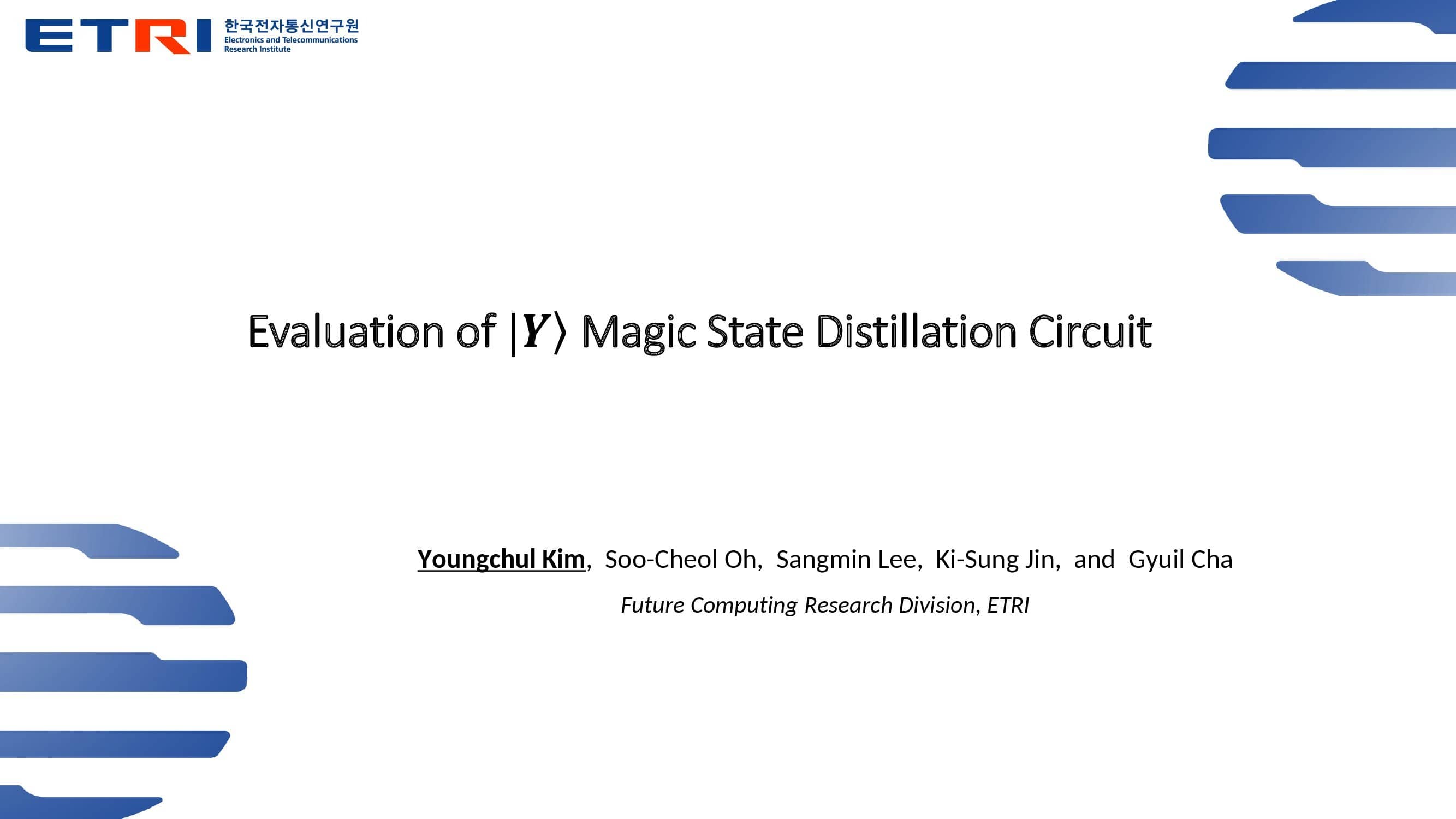 Hello, everyone. My name is Youngchul Kim. I am with ETRI in Korea. Today I will be talking about ˇ°Evaluation of |Y> Magic State Distillation Circuit". |
