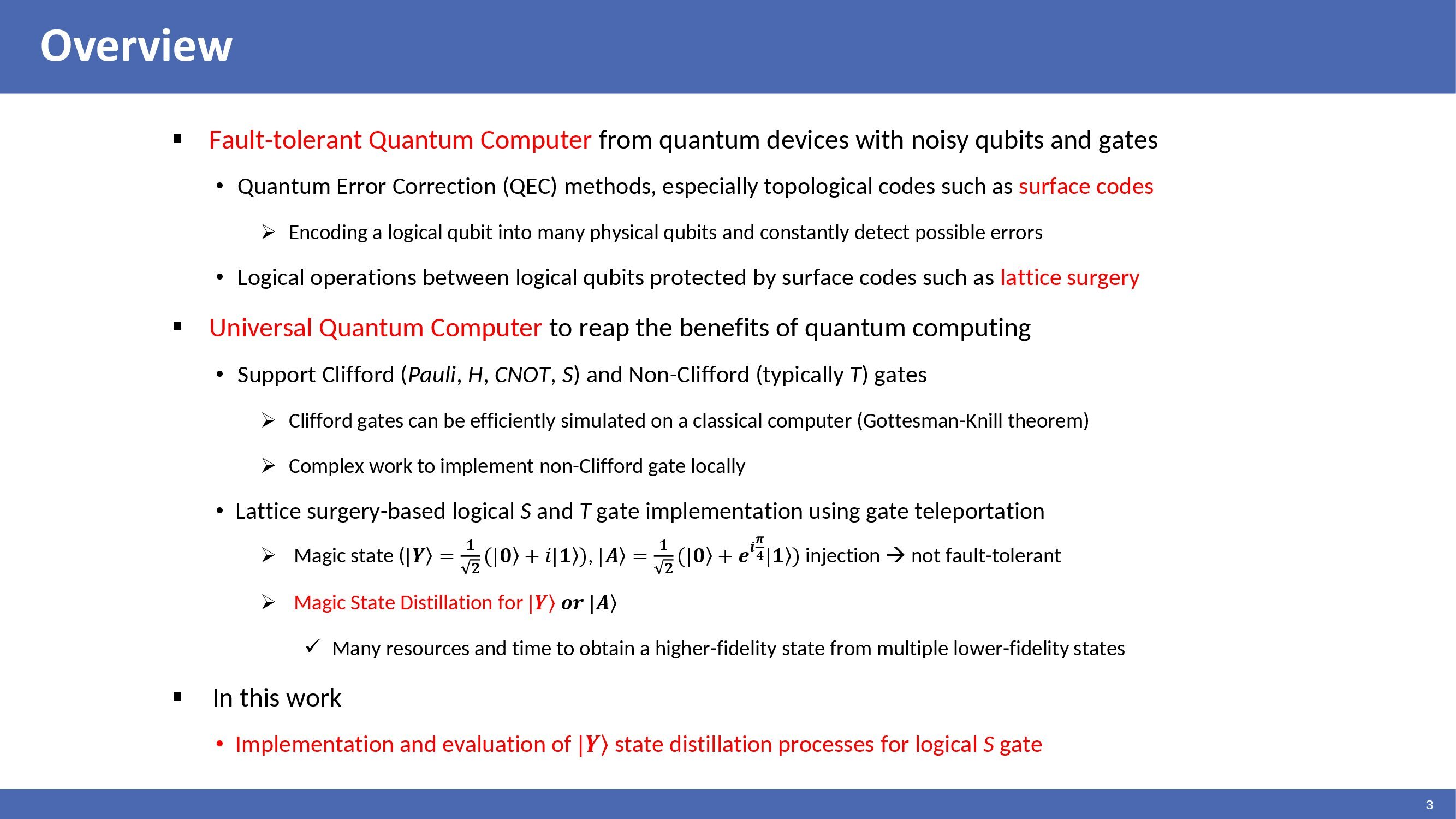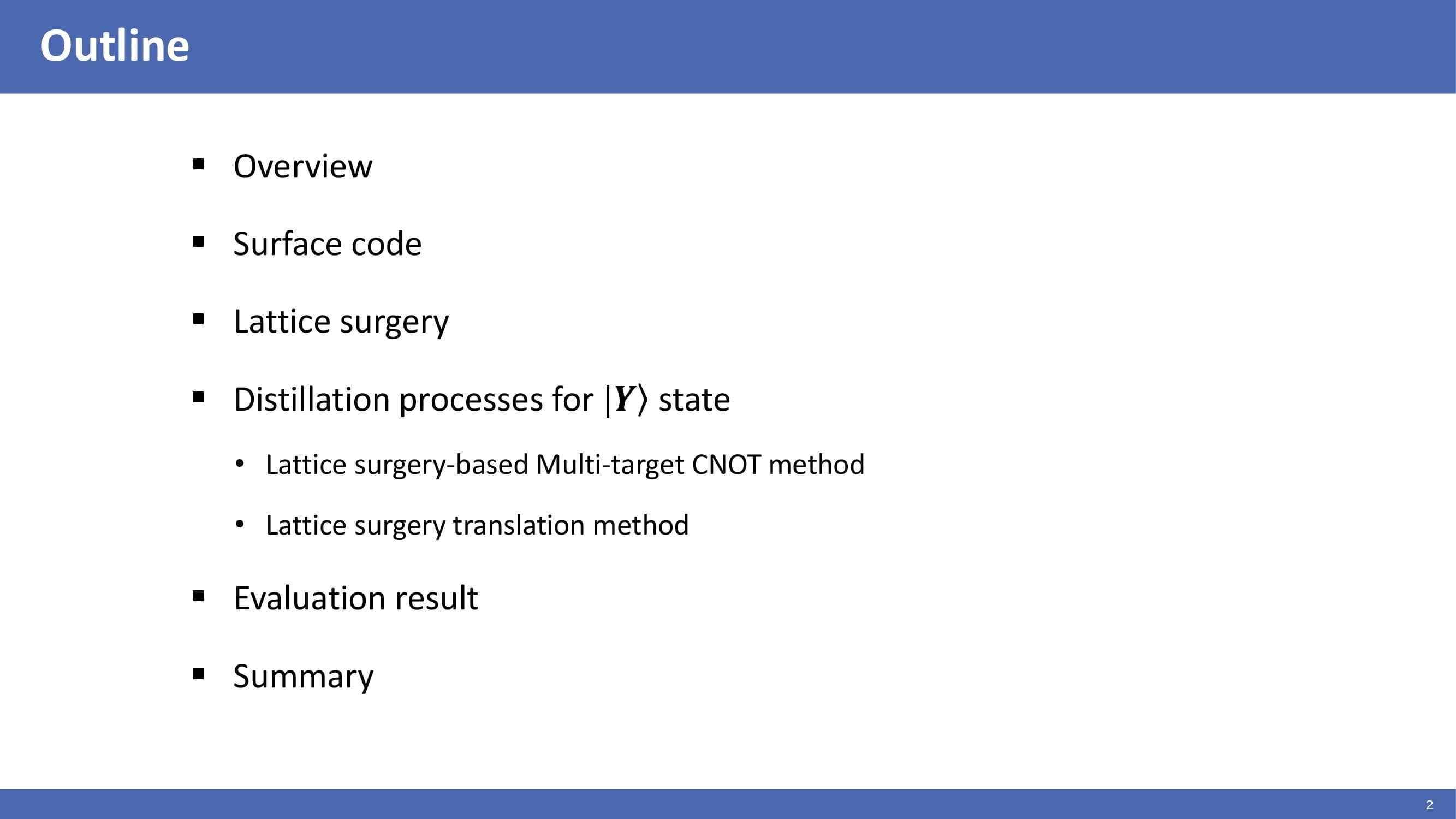 This is the outline of my presentation. I will start with an overview. Next, I will look at surface code and lattice surgery on surface codes. Then, I will introduce a distillation process for |Y> state and explain two implementation methods for |Y> distillation process. After that, I will show the evaluation results. Lastly, I will summarize. |