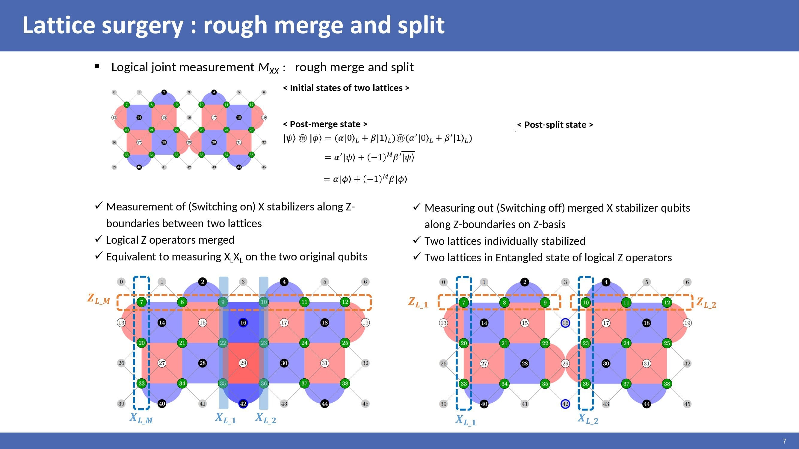Rough merging is a measurement of X stabilizer along Z-boundaries between two lattices. Logical Z operators of two lattices are merged. Rough merging is equivalent to measuring the logical X operator of two lattices. Rough splitting is performed by measuring out merged X stabilizer qubits along Z-boundaries on Z-basis. After that, two lattices are individually stabilized. And so, two lattices are in an entangled state of logical Z operators. |