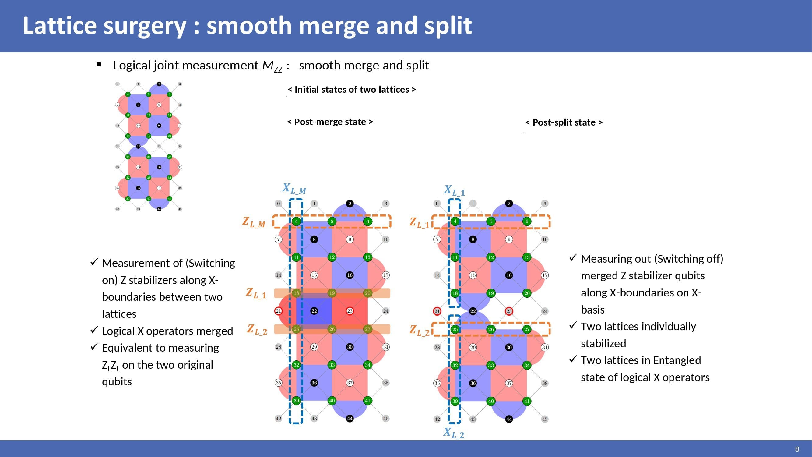 Smooth merging is a measurement of Z stabilizer along X-boundaries between two lattices. Logical X operators of two lattices are merged. Smooth merging is equivalent to measuring the logical Z operator of two lattices. Smooth splitting is performed by measuring out merged Z stabilizer qubits along X-boundaries on X-basis. After that, two lattices are individually stabilized. And so, two lattices are in an entangled state of logical X operators. |