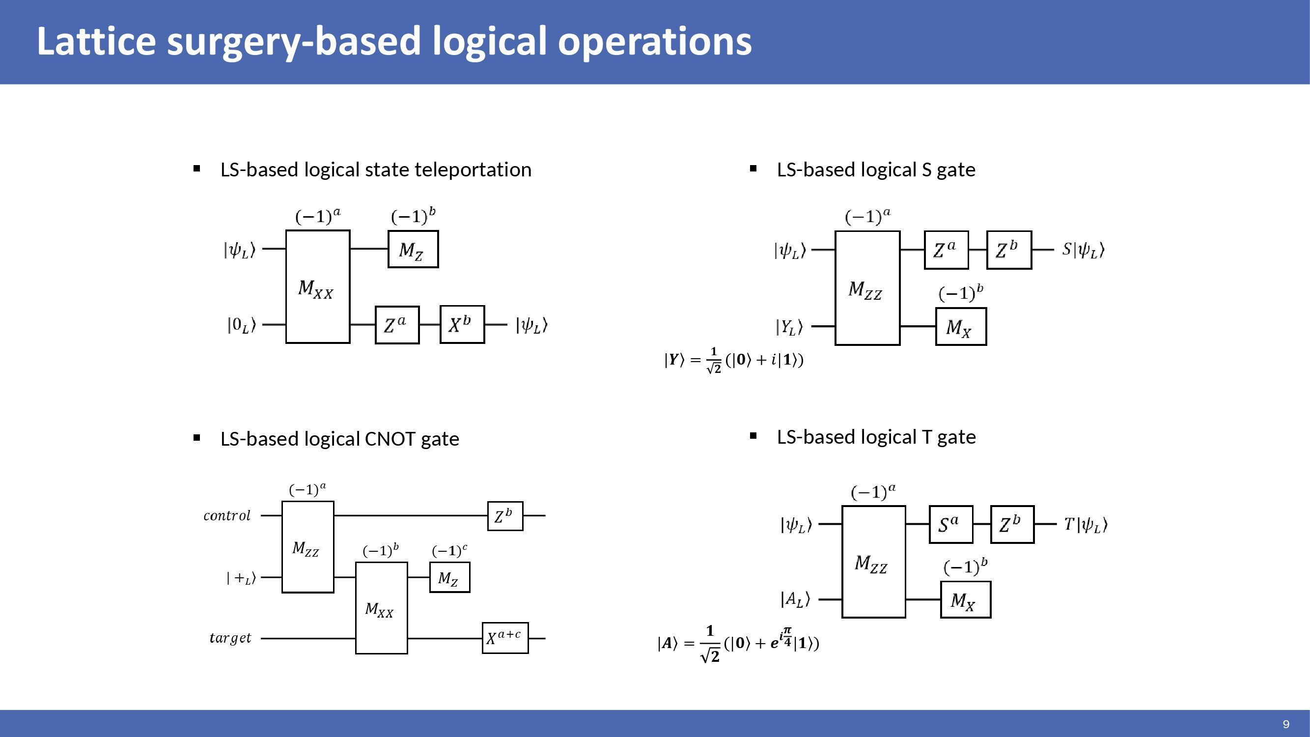 These circuits show lattice surgery-based logical operations. The logical qubit state can be teleported to the other qubit by logical joint measurement Mxx. Logical CNOT between two logical qubits can be performed through an ancilla qubit using logical joint measurements Mzz and Mxx. Logical S and T gates can be performed by gate teleportation using magic states |Y> and |A>. The Pauli corrections are performed post-operations in these circuits depending on the measurement outcomes. |