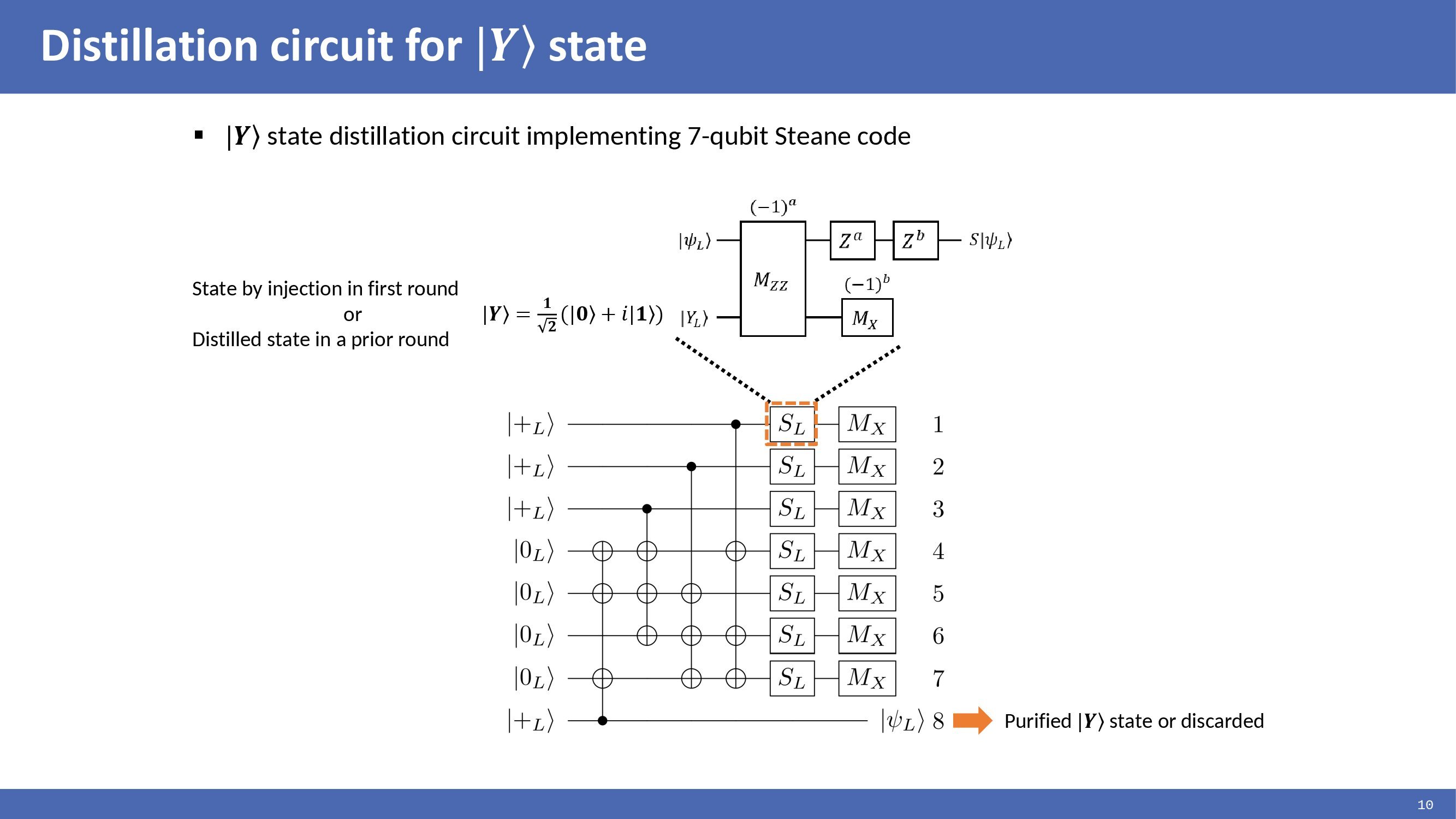 The distillation circuit for |Y> state can be implemented using the 7-qubit Steane code. The 7-qubit Steane is one of the quantum error correction codes. This circuit consists of initialization of |0> and |+>, multi-target CNOTs, logical S gate teleportation, and X-basis measurements. In this circuit, seven qubits are encoded in Steane code and entangled with qubit 8 using the multi-target CNOTs. After that, seven encoded qubits are each rotated with an S gate using |Y> state. The |Y> state used is either the injected state in the first round or the state distilled in a prior round. The output state on qubit 8 is interpreted by evaluating the X-basis measurement outcomes of the seven qubits and eigenvalues of the Steane code X stabilizers. If the two conditions are satisfied, the output is considered purified |Y> state. Otherwise, the state is discarded, and the subsequent distillation rounds are performed. |