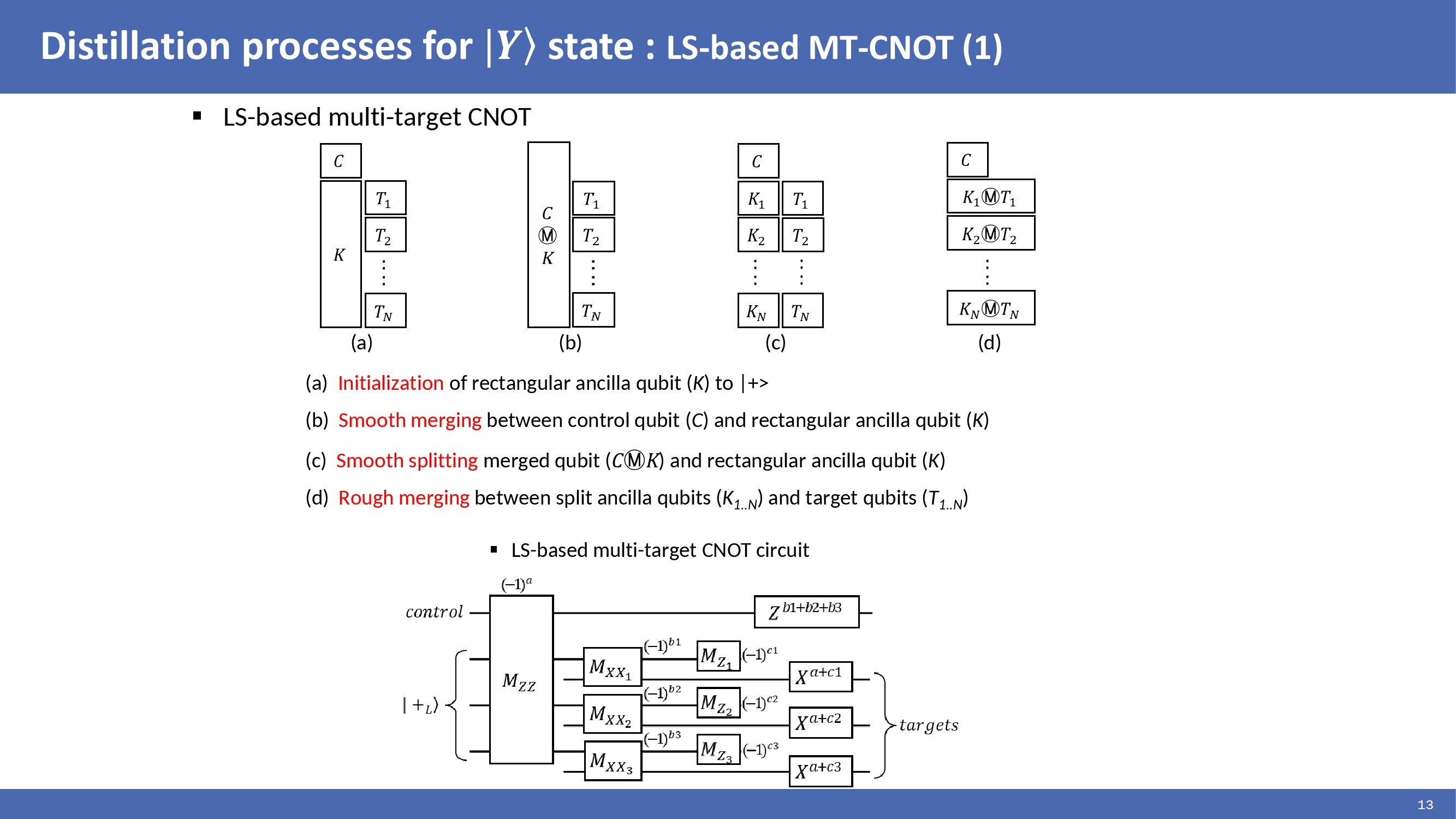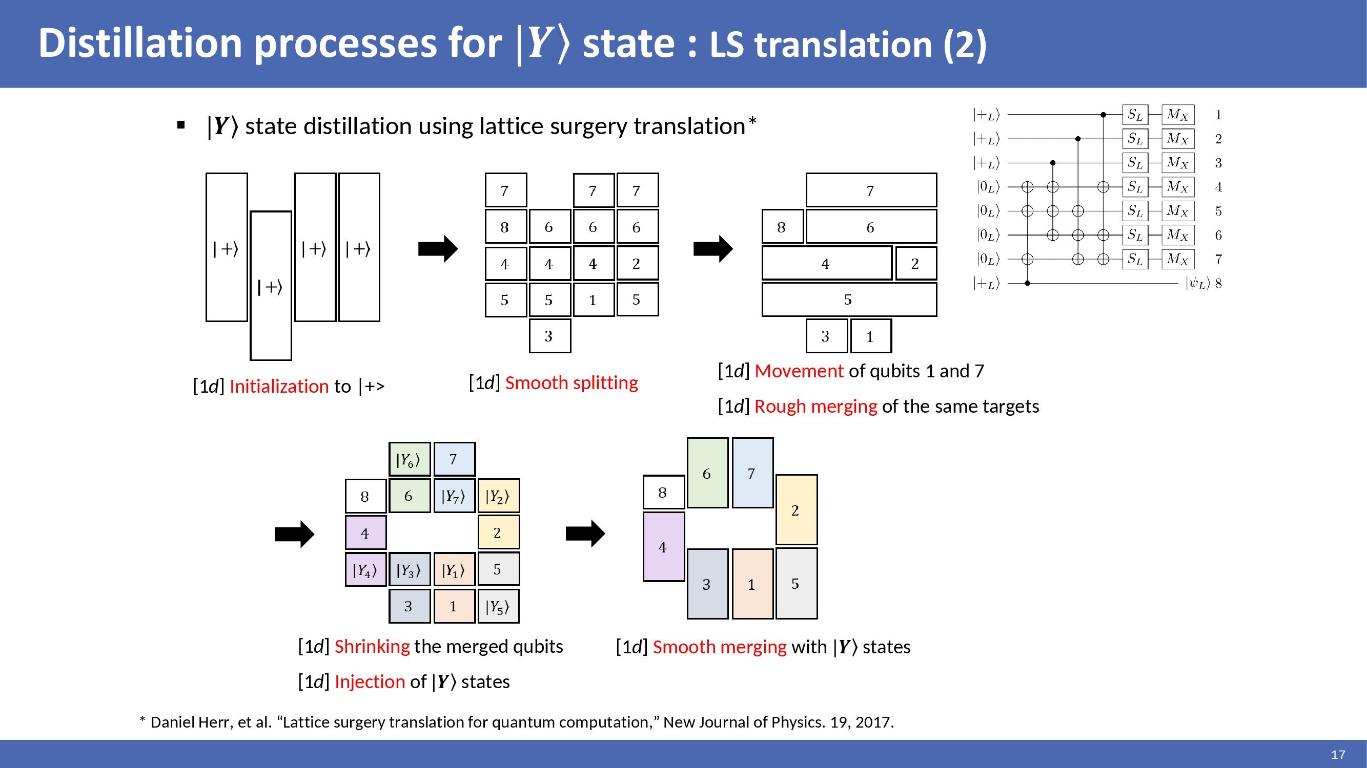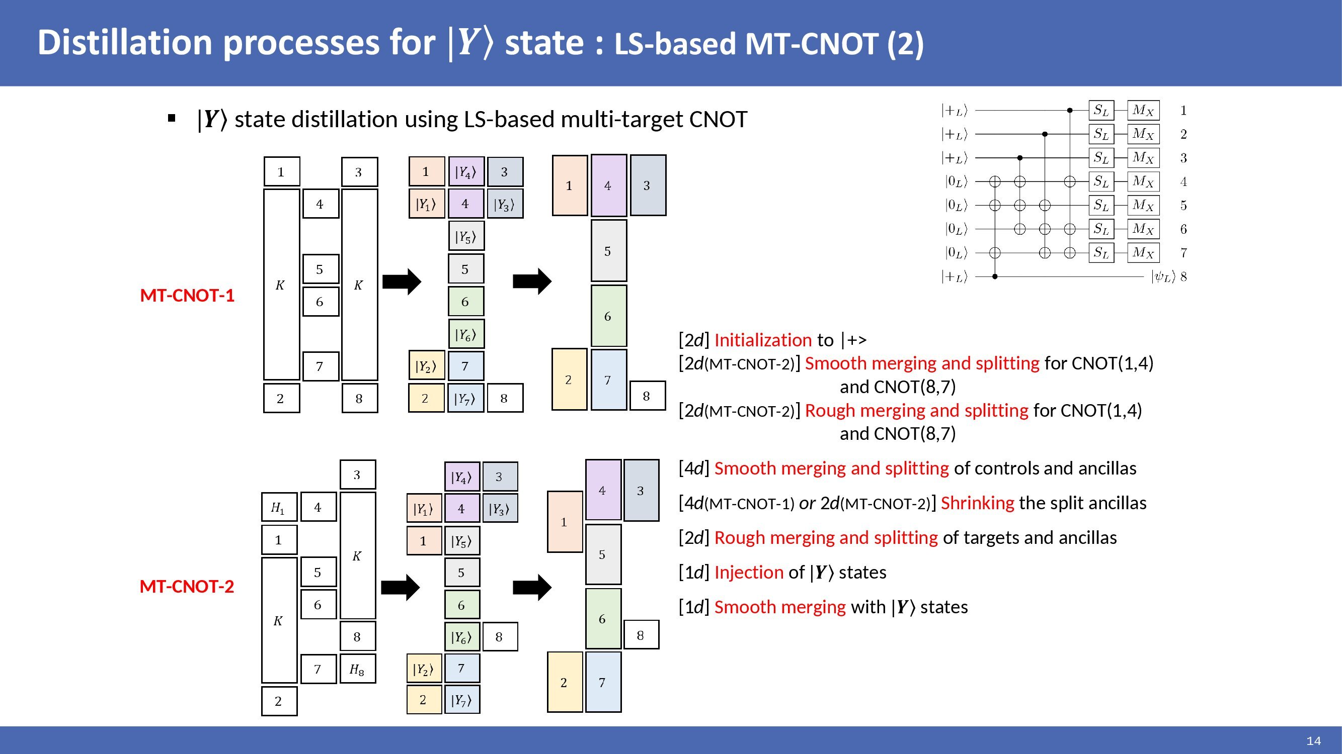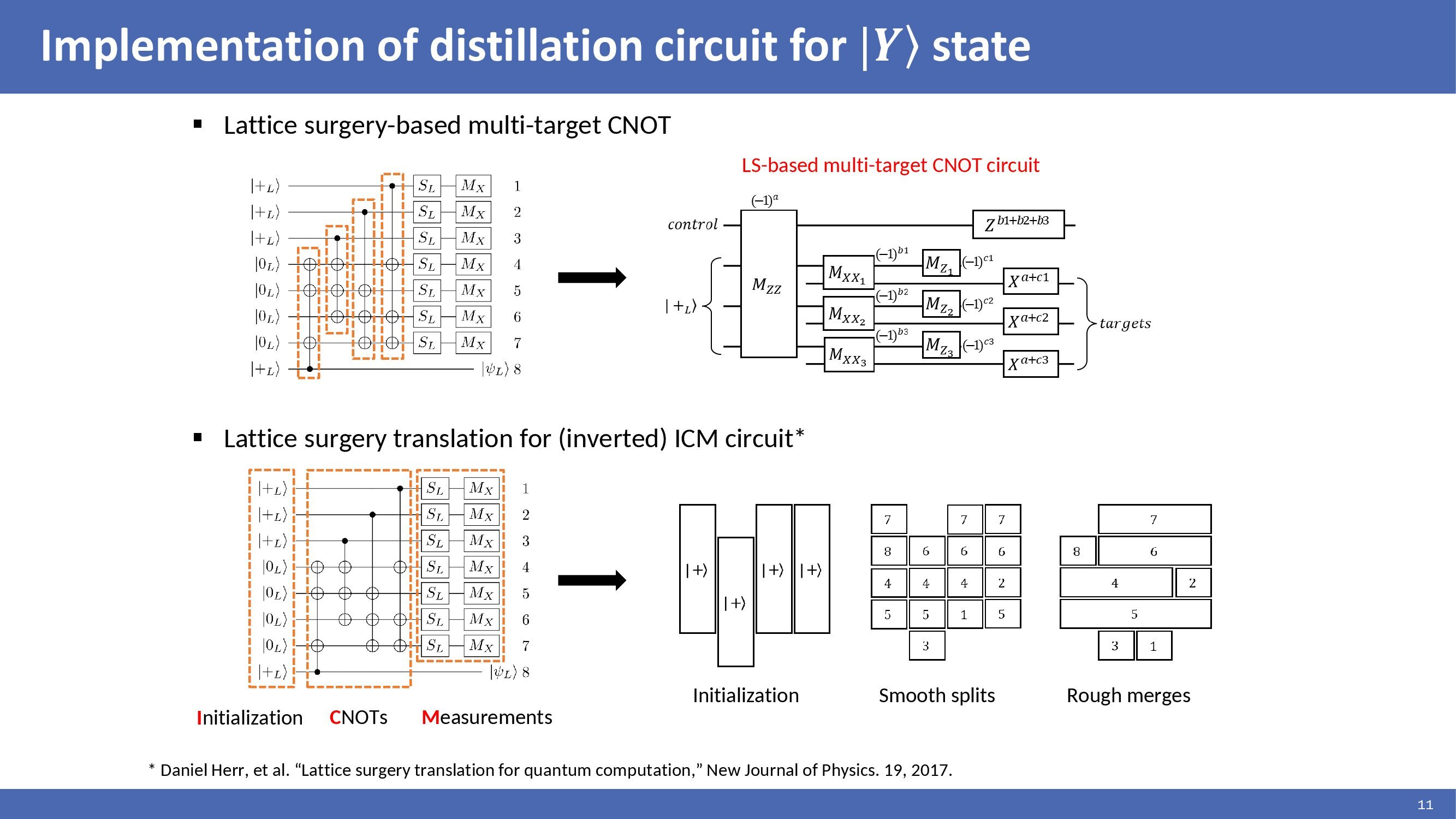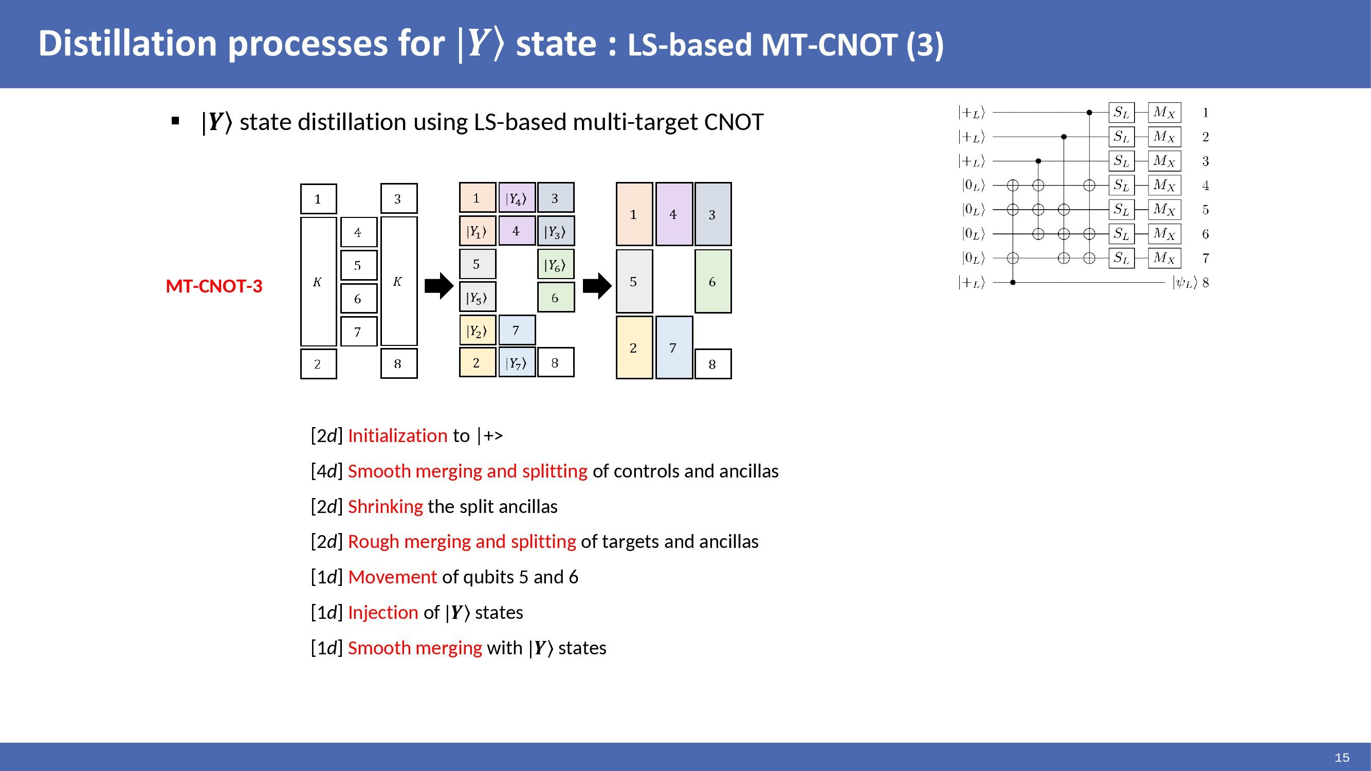 |Y> state distillation circuit consisting of multi-target CNOTs can be translated to lattice surgery as presented by Daniel and implemented as shown in the figures. In the figures, each rectangular corresponds to a multi-target CNOT. Each rectangular is split, and the identical target qubits are merged to perform CNOT operations. This method reduced the time cost by translating multi-target CNOTs to be suitable for lattice surgery. |