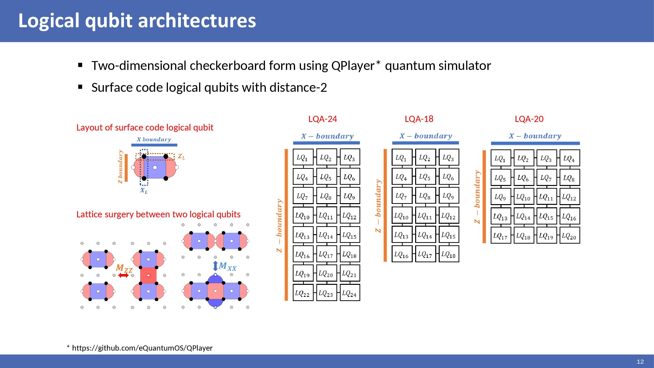 We have constructed a two-dimensional checkerboard form of logical qubit architecture using the QPlayer quantum simulator to implement and evaluate the distillation processes. Each logical qubit is encoded as rotated surface codes with distance 2. It requires seven physical qubits to encode a logical qubit. Figures show the layout of the surface code logical qubits and the lattice surgery method between two logical qubits. The figures show that the distillation processes were implemented in a logical qubit architecture of 24, 18, and 20 qubits. |