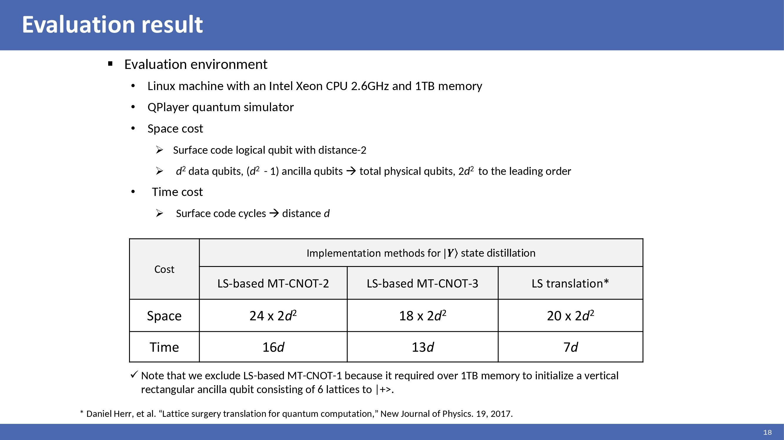 We have implemented and evaluated this environment. We used a QPlayer quantum simulator. The metrics are space and time costs. The space cost can be given regarding the number of physical qubits. We used surface code logical qubits with a distance of 2, so the space cost is 2d squared. The evaluation results show that the Y-state distillation circuit can be implemented using lattice math. Daniel's method can implement the distillation circuit at a lower cost. However, Daniel's method requires considering the layout structure to achieve optimal results. However, the distillation circuit can also be implemented in a regular checkerboard logic qubit structure with fewer qubits. |