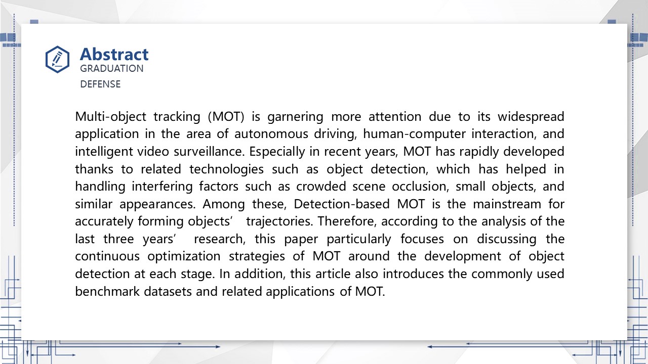 Multi-object tracking (MOT) is garnering more attention due to its widespread application in the area of autonomous driving, human-computer interaction, and intelligent video surveillance. Especially in recent years, MOT has rapidly developed thanks to related technologies such as object detection, which has helped in handling interfering factors such as crowded scene occlusion, small objects, and similar appearances. Among these, Detection-based MOT is the mainstream for accurately forming objects¡¯ trajectories. Therefore, according to the analysis of the last three years¡¯ research, this paper particularly focuses on discussing the continuous optimization strategies of MOT around the development of object detection at each stage. In addition, this article also introduces the commonly used benchmark datasets and related applications of MOT.