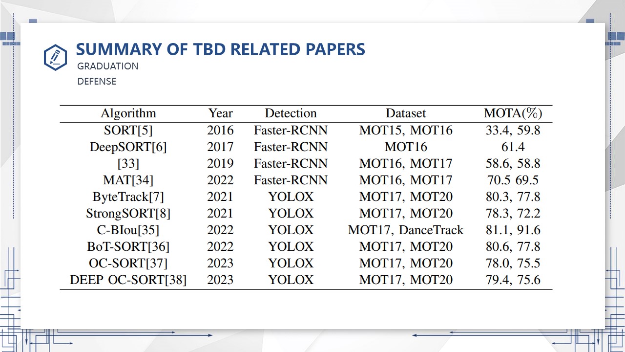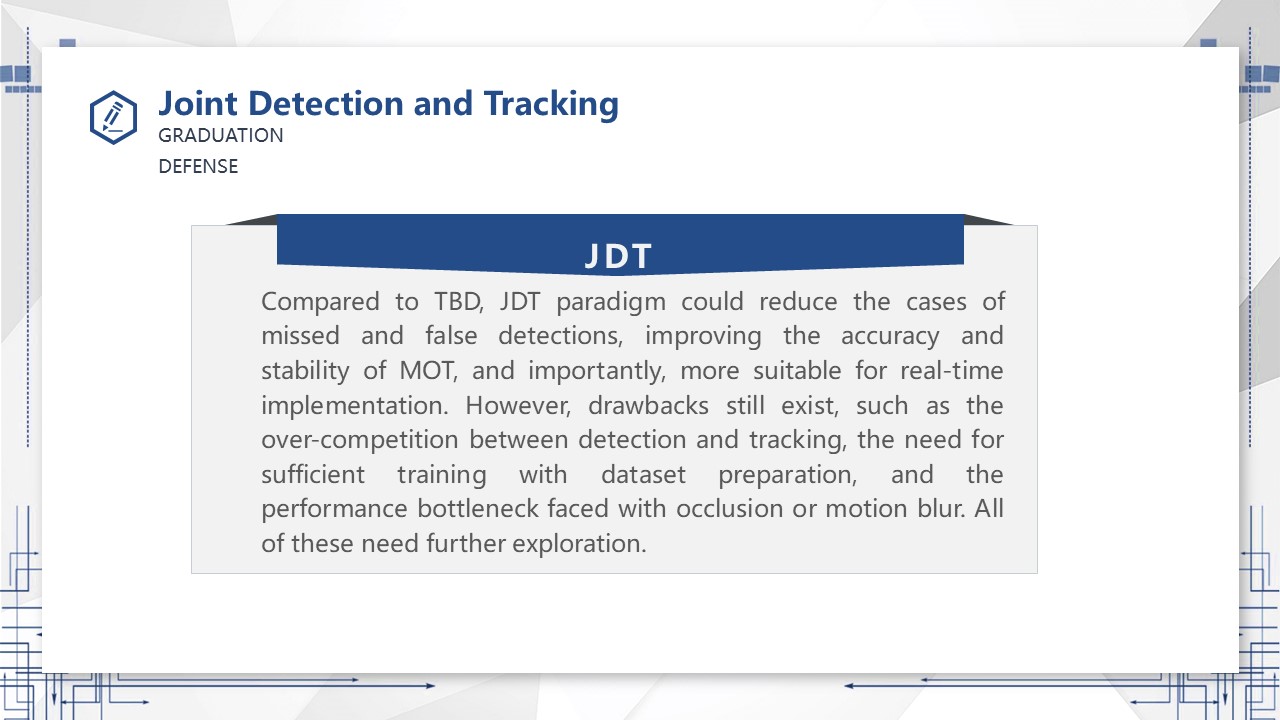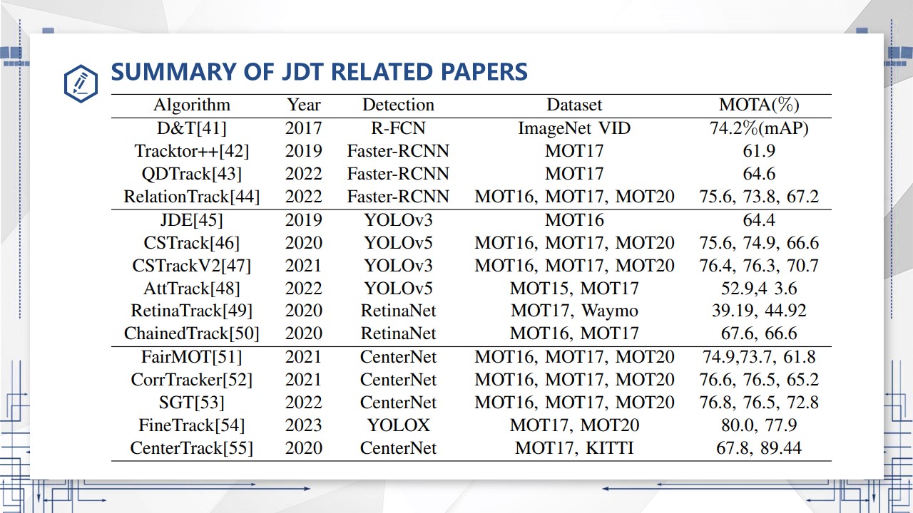 Compared to TBD, JDT paradigm could reduce the cases of missed and false detections, improving the accuracy and stability of MOT, and importantly, more suitable for real-time implementation. However, drawbacks still exist, such as the over-competition between detection and tracking, the need for sufficient training with dataset preparation, and the performance bottleneck faced with occlusion or motion blur. All of these need further exploration. |