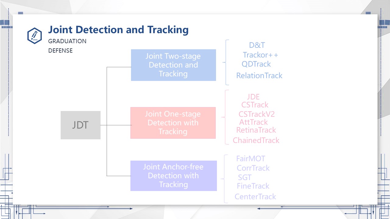 For the Joint Detection and Tracking method, we divided it into three types based on the different joint detectors: Joint Two stage Detection and Tracking, Joint One stage Detection with Tracking, and Joint Anchor free Detection with Tracking. We analyzed and summarized the relevant methods of each method. |